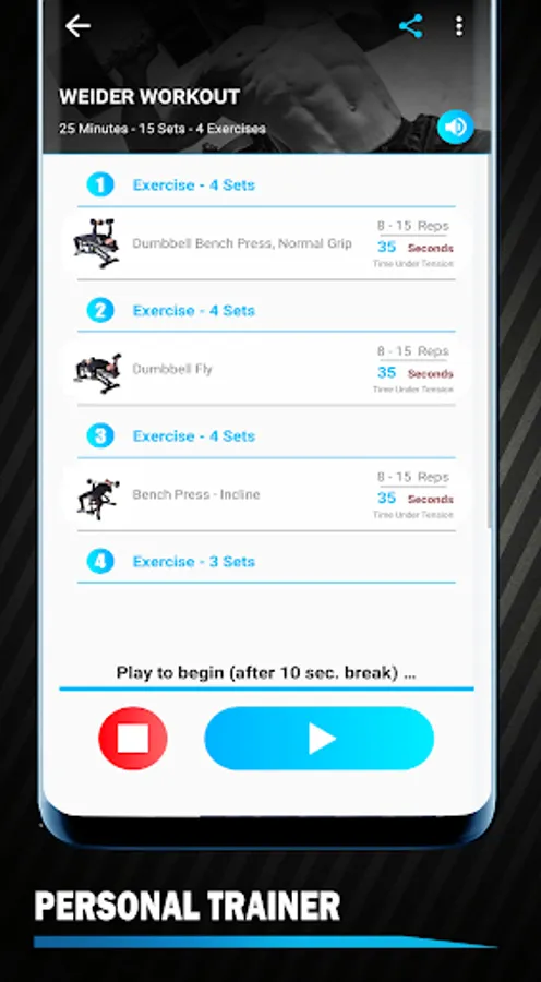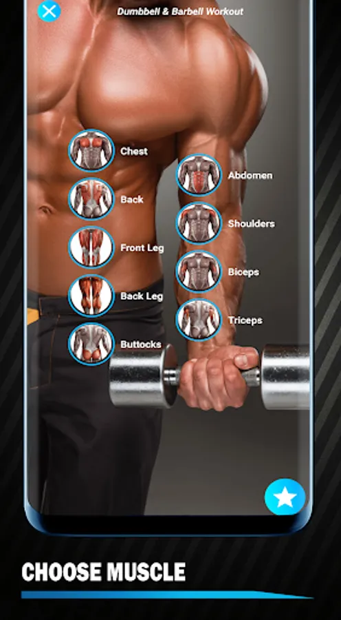 Training by muscle group (Fitness app has exercises for abdominals, chest, legs, back, shoulders, biceps, triceps and exercises for the whole body)
