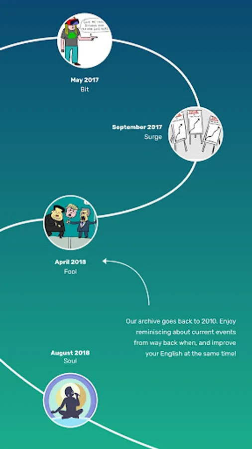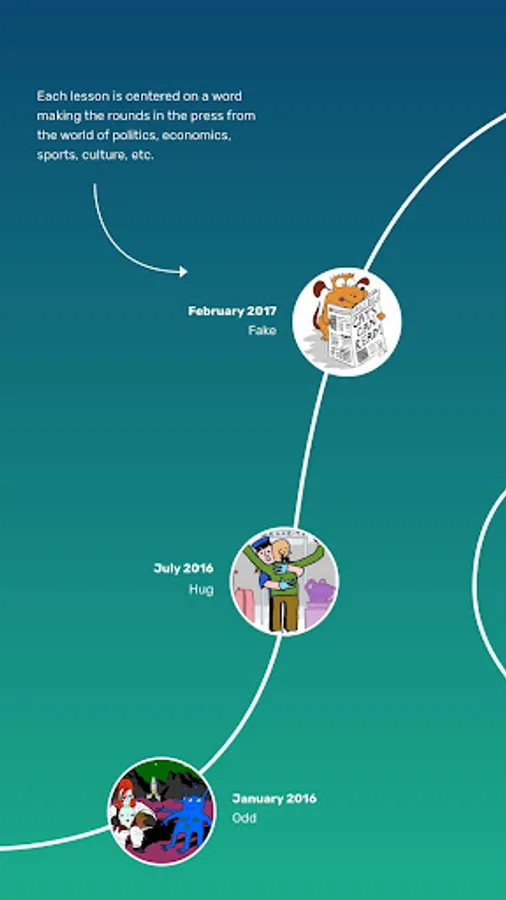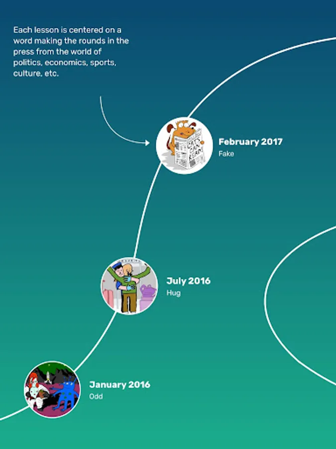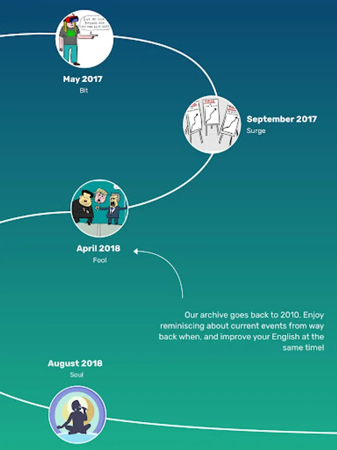 Words in the news. Each lesson is centered on a word making the rounds in the press from the world of politics, economics, sports, culture, etc. Learn vocabulary, idioms, definitions and more while taking a fun look at the headlines, past and present. Our archive goes back to 2010. Enjoy reminiscing about current events from way back when, and improve your English at the same time!