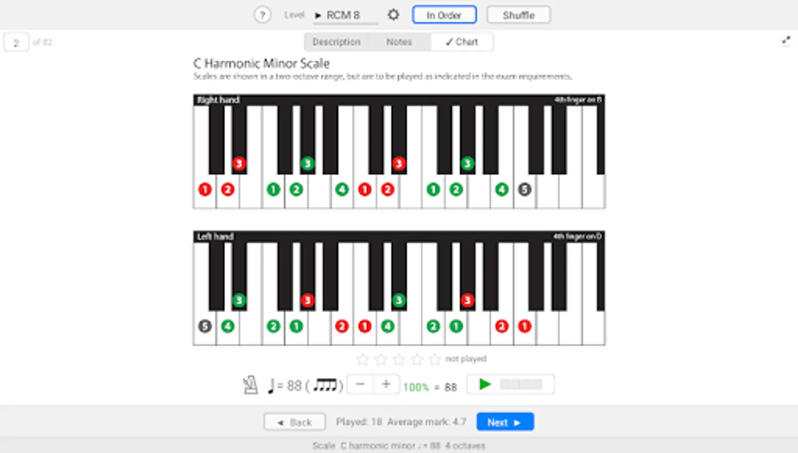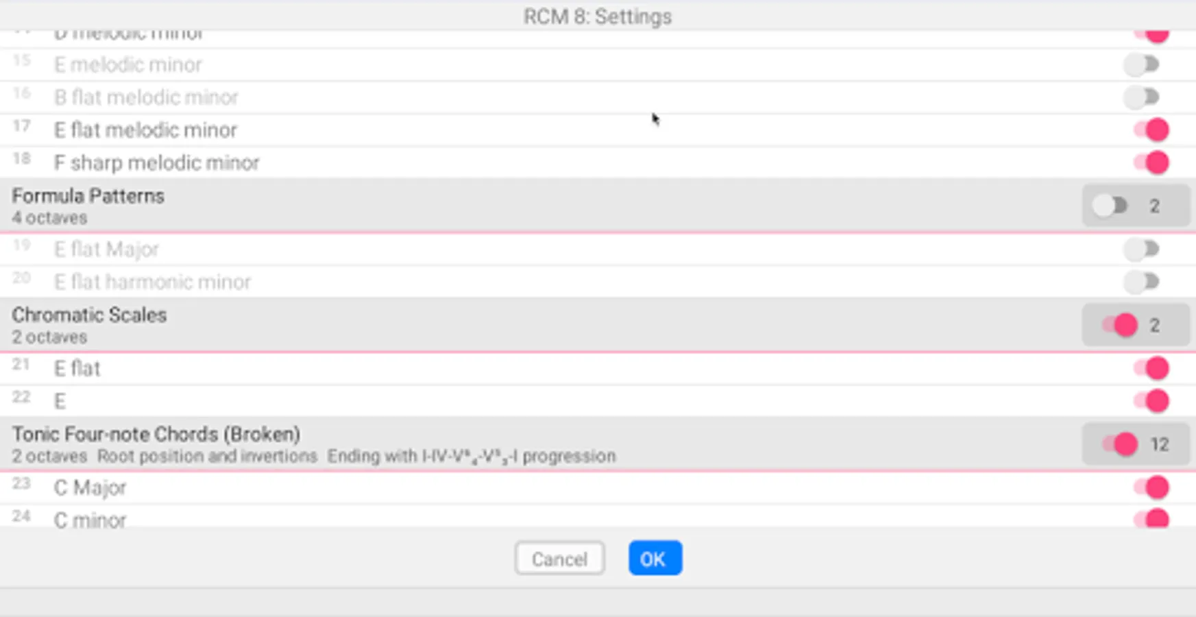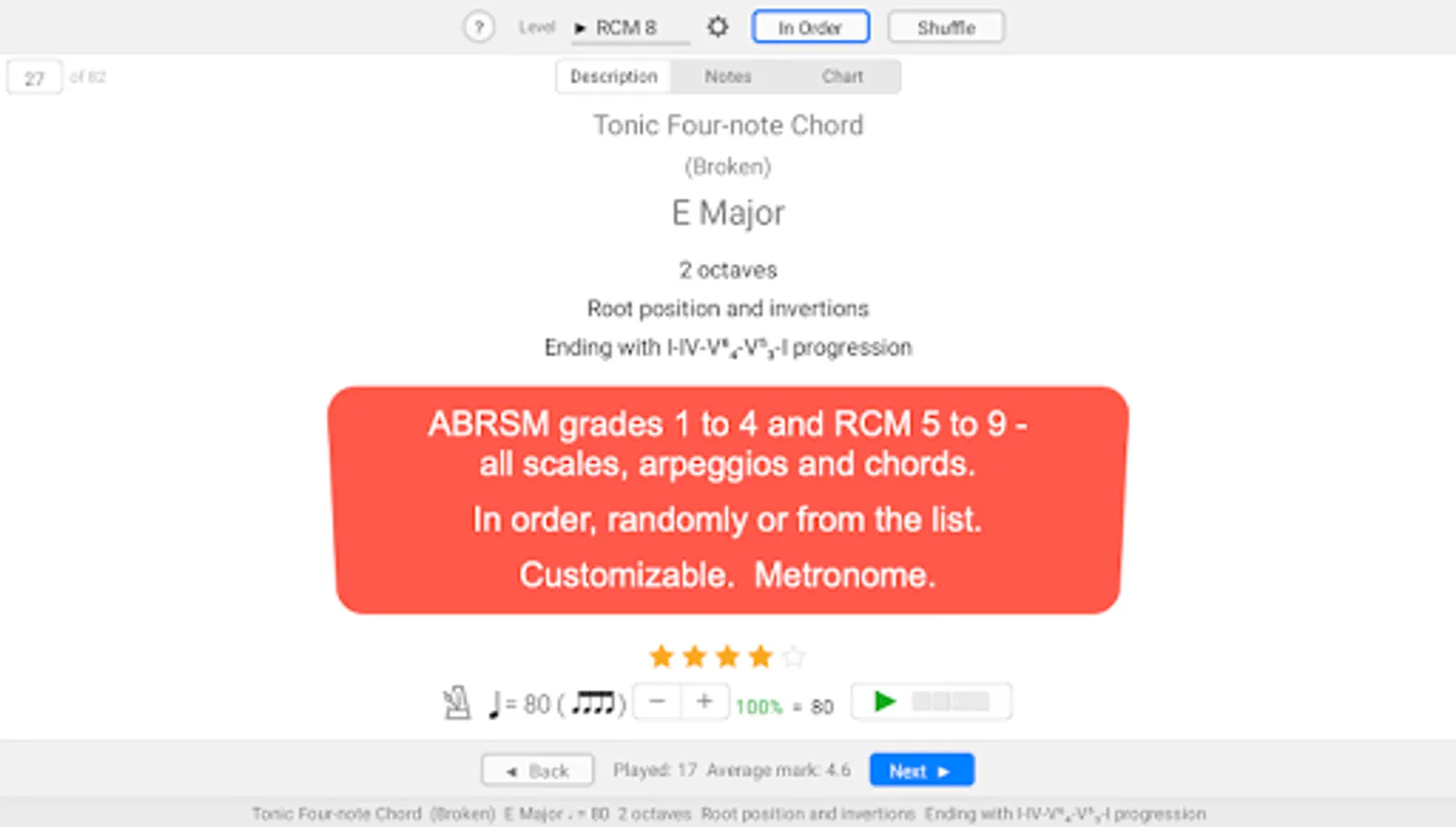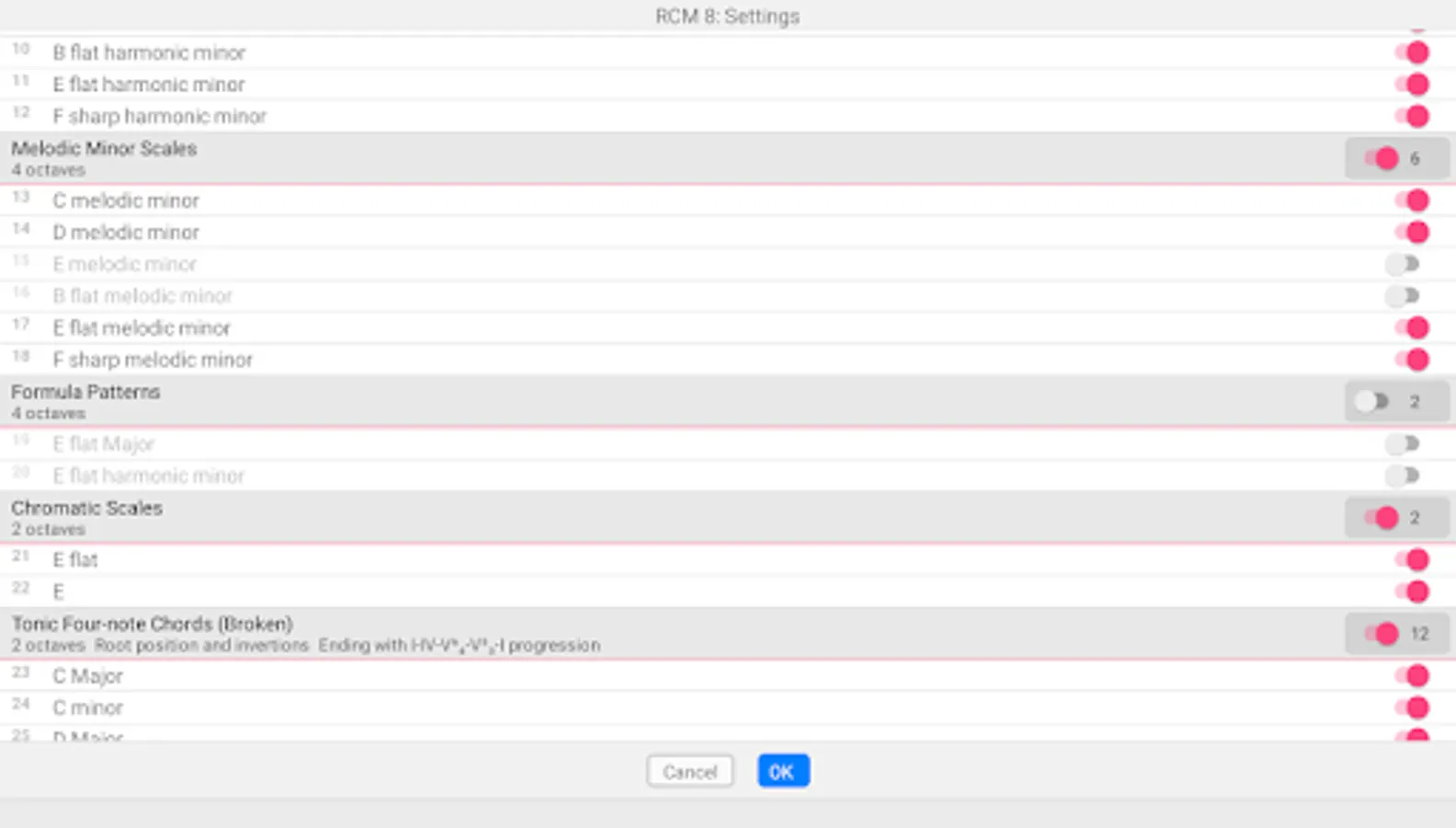 • All Technical Tests (scales, arpeggios, chords) for ABRSM grades 1 to 4 and RCM levels 5 to 9.