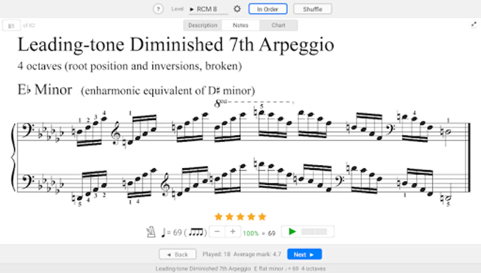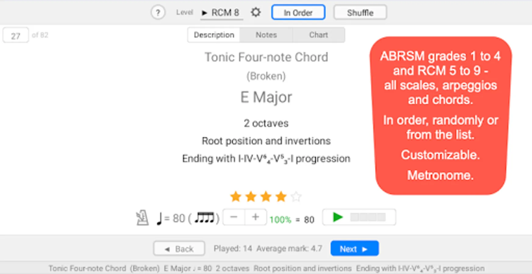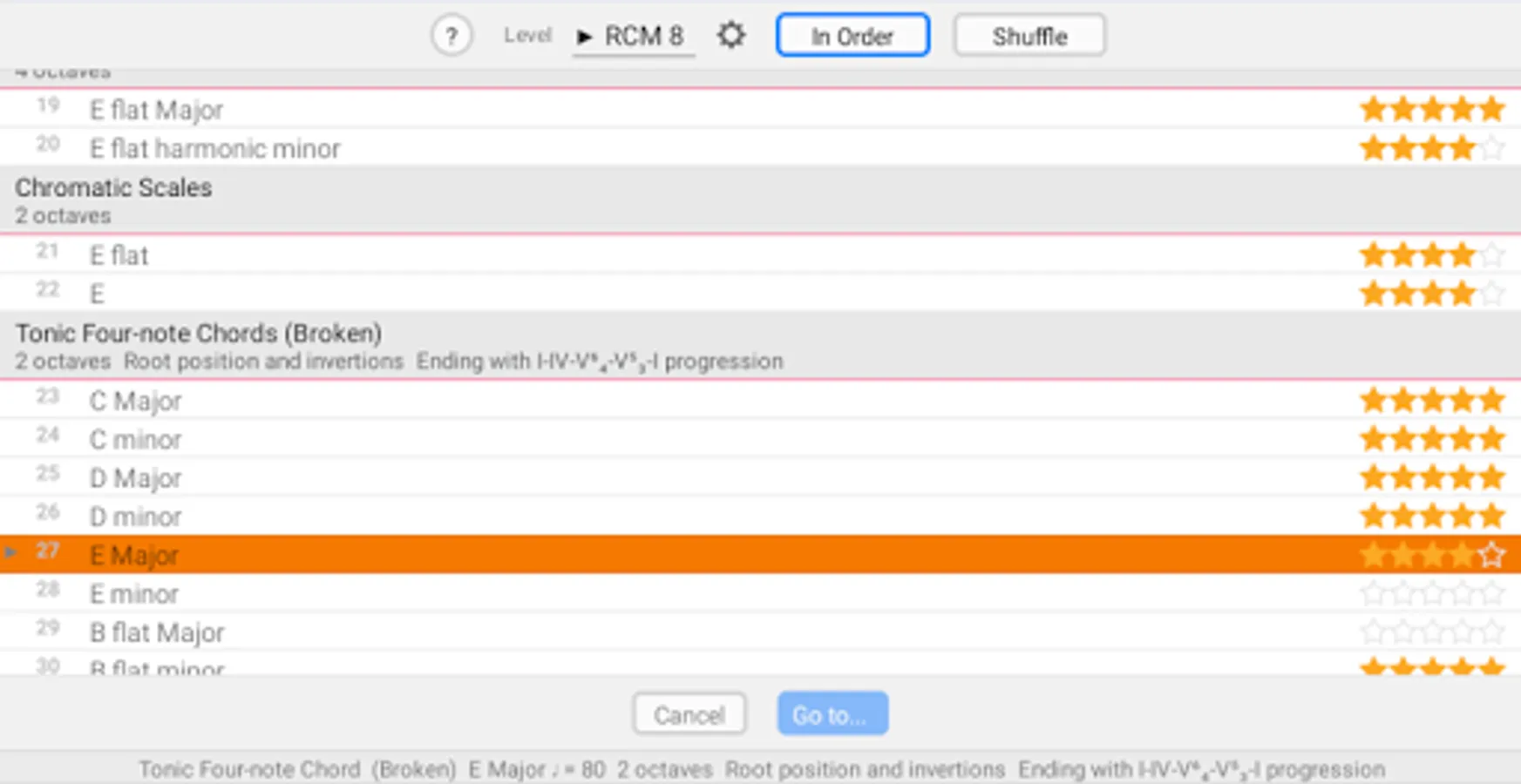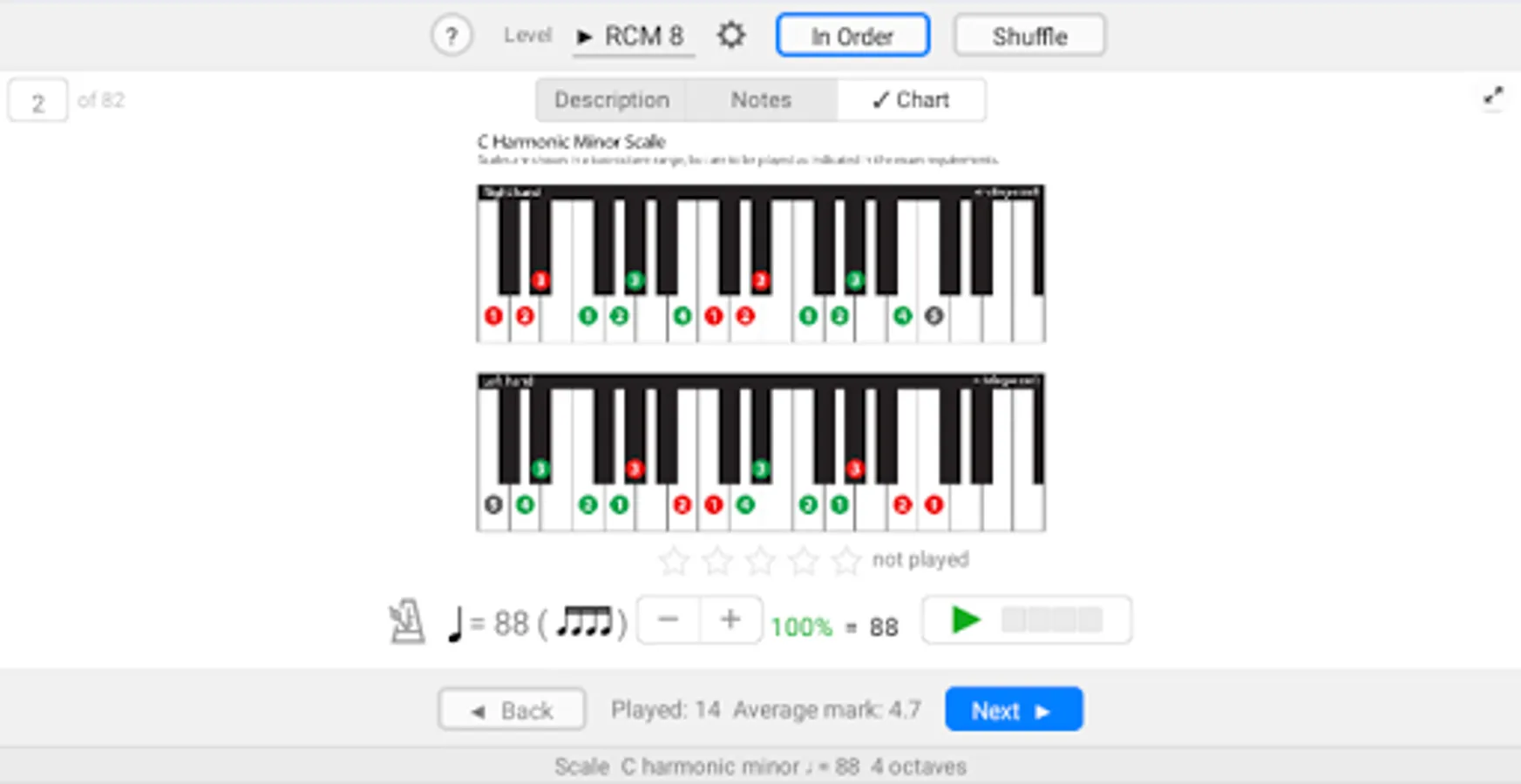 • All Technical Tests (scales, arpeggios, chords) for ABRSM grades 1 to 4 and RCM levels 5 to 9.