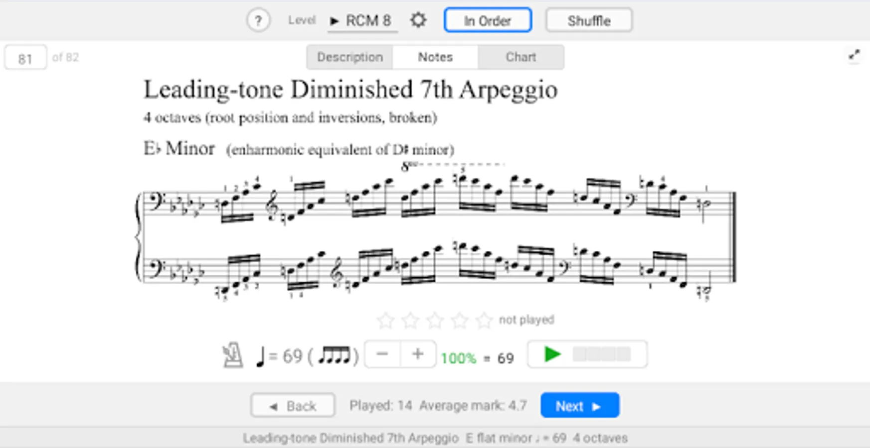 • All tests come with high quality sheet music with fingering. Scales have fingering charts. Both may be expanded full screen and printed.