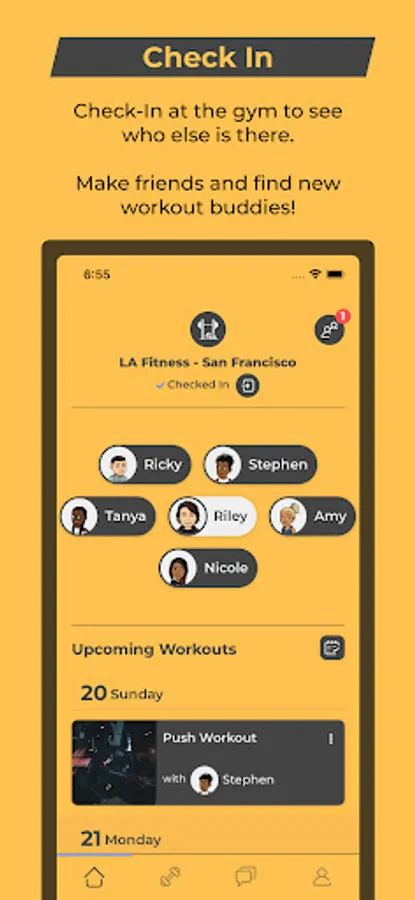 When you arrive at the gym, open the GYMM app and check-in. You‘ll see the profiles of all the other people who are at the gym at that moment.