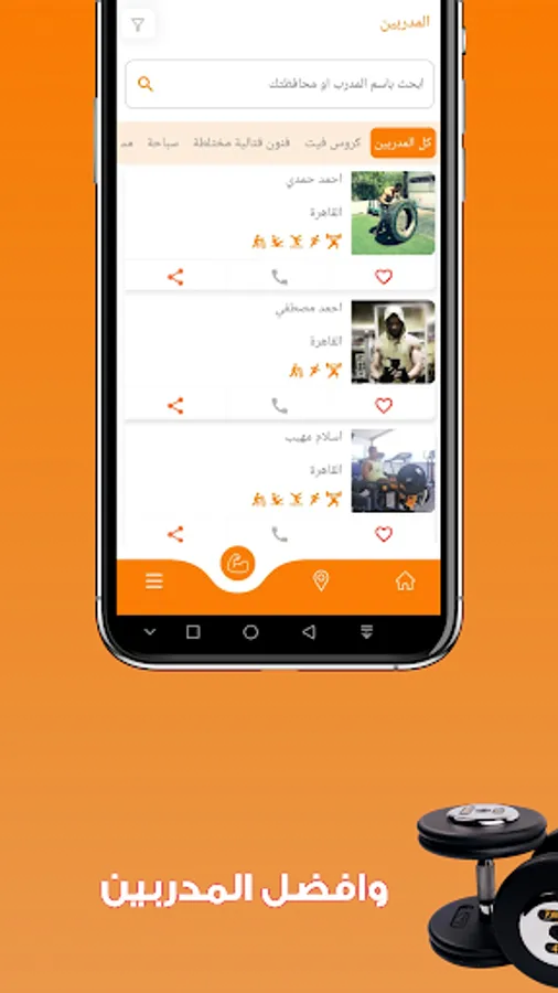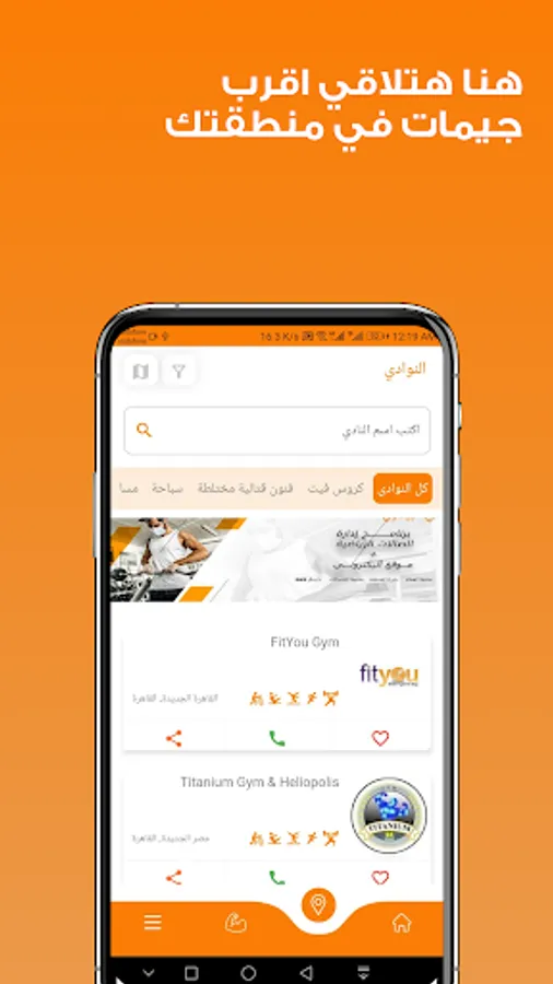 Once you download the application, you will be able to search and reach the nearest and most suitable gym for you, whether searching by map, searching by sections, or searching by word. You can filter the gyms according to the city, region, services, as well as discounts. You can also search for a personal trainer and communicate with him directly