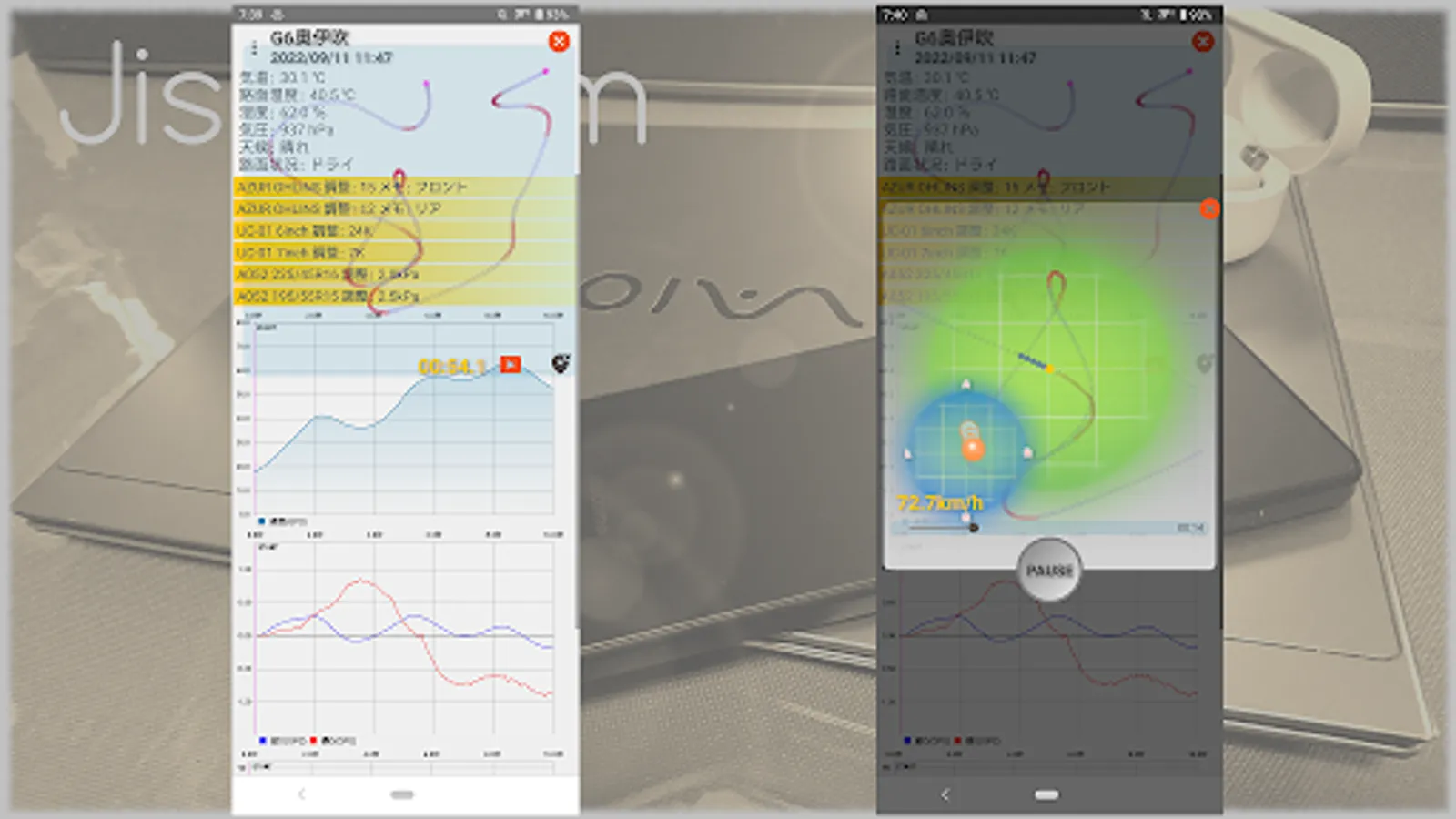 ⑥Tap the driving data to display the driving data confirmation screen.On the confirmation screen, graphs of temperature, humidity, road surface temperature, weather, road surface condition, barometric pressure, setting information, running locus, speed, acceleration, pitch and roll are displayed. Various graphs can be pinched and traced.