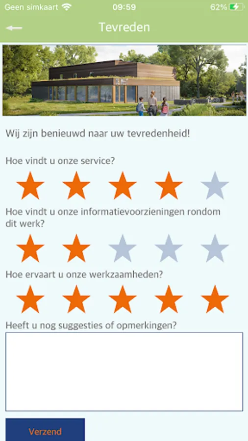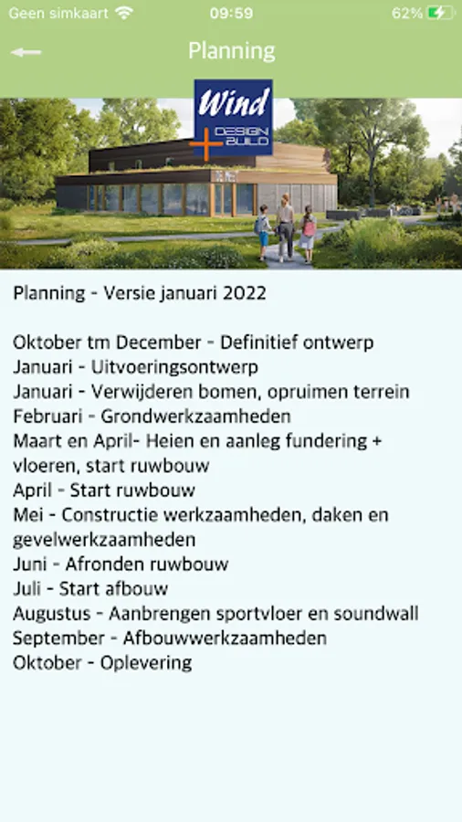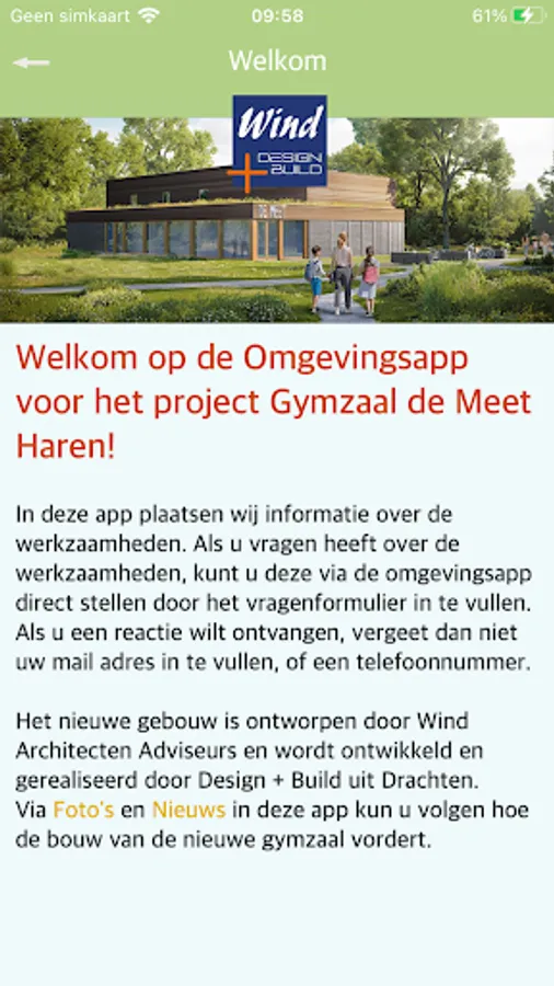 In this app you will find all information about the activities of the project 'Gymzaal de Meet in Haren' by Wind Groep. Important project information, the latest schedule and contact information are displayed . You can also leave questions, comments or complaints related to the project on this app.