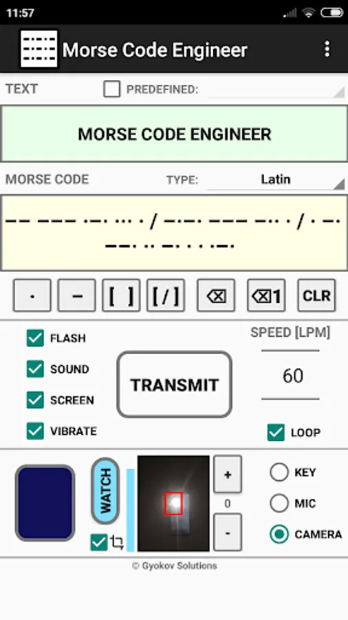The app can watch and decode morse code transmission using light. To turn listening on select [CAMERA] on input panel and press [WATCH] button. The app watches and detects morse code light transmission and writes morse code in morse code box and translated text in text box.