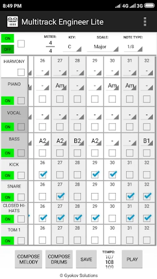 - COMPOSE MELODY button - when you press it then melody is created for selected instruments. If no instrument is selected then all instruments are used. If you want to auto compose specific notes from instrument select notes checkboxes.