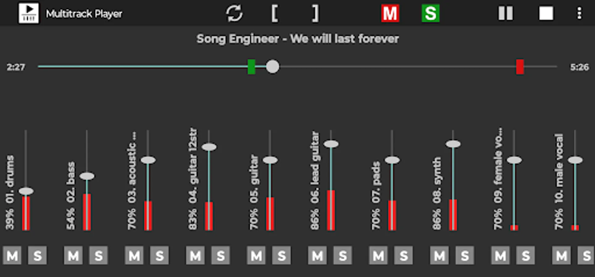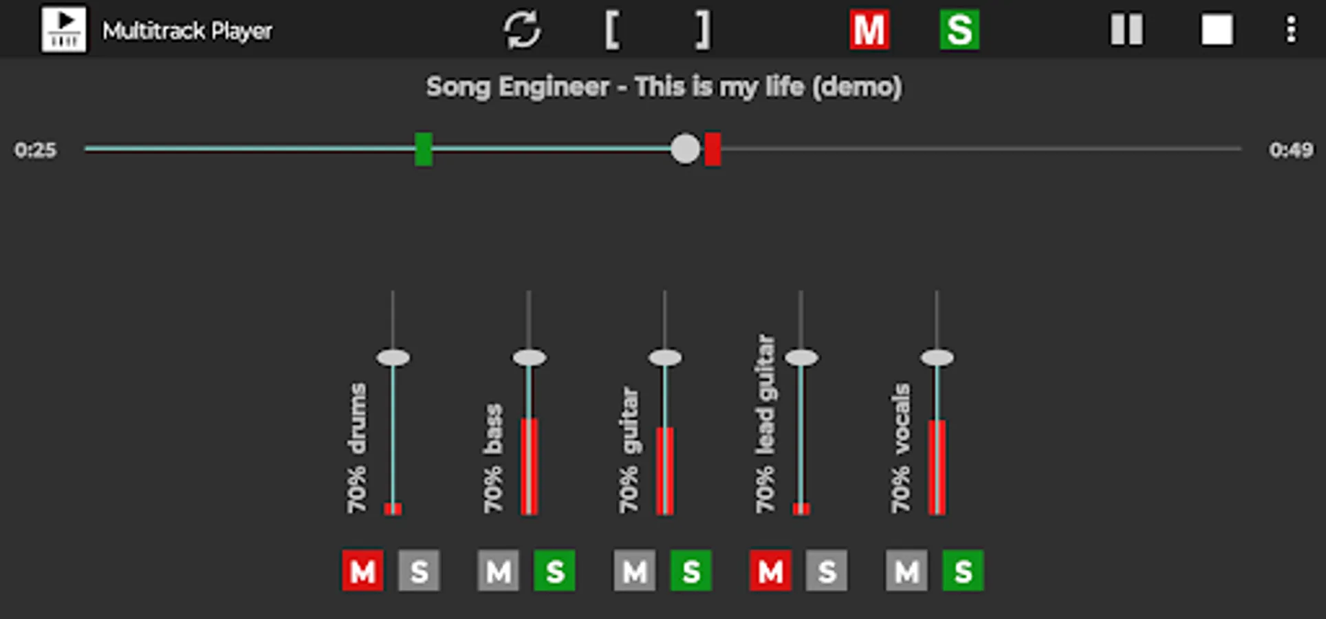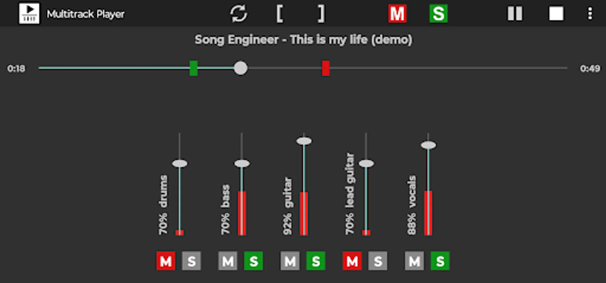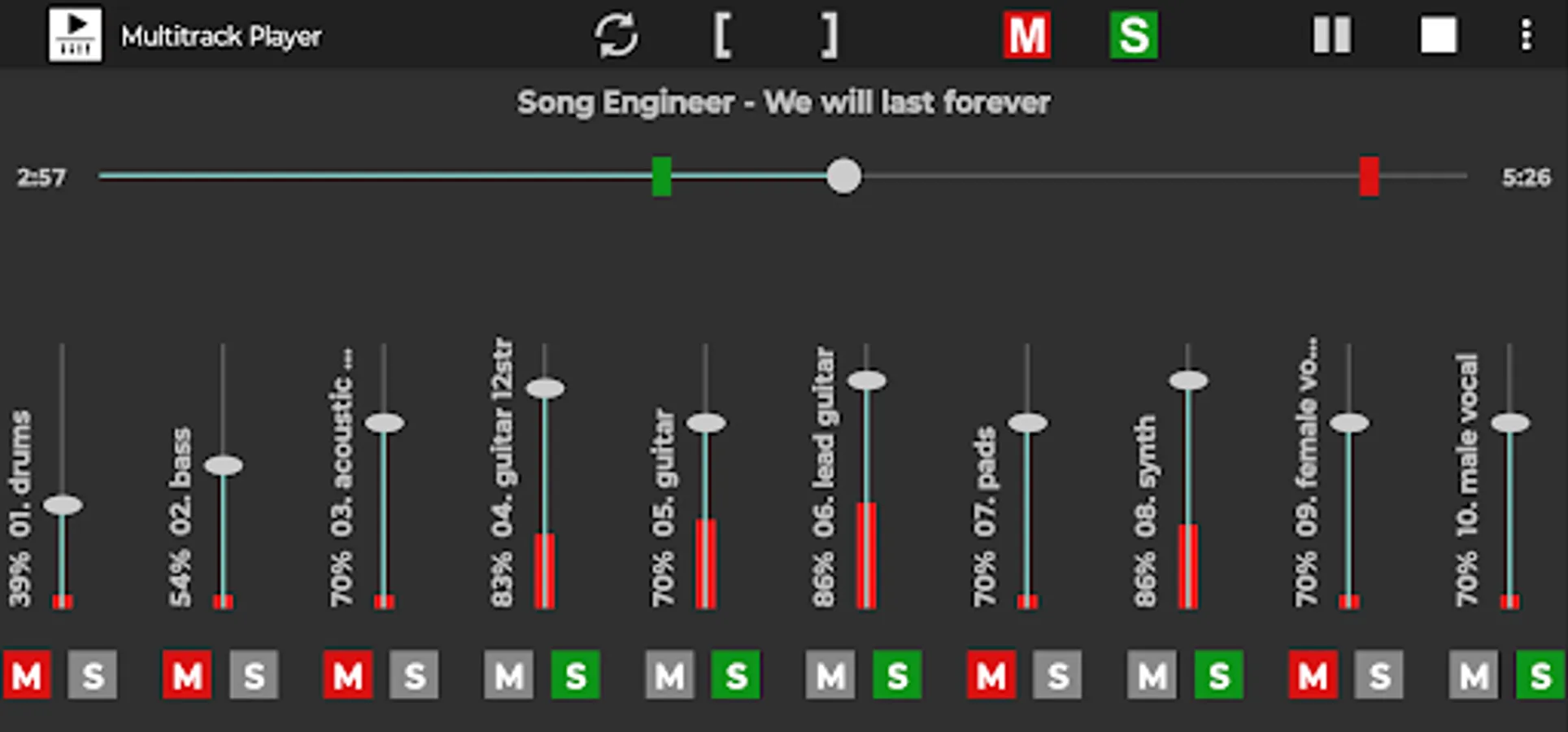 Multitrack Player is simple multitrack songs player. Just open folder that contains instrument track files and play it. You can solo/mute every instrument track and change its loudness level.