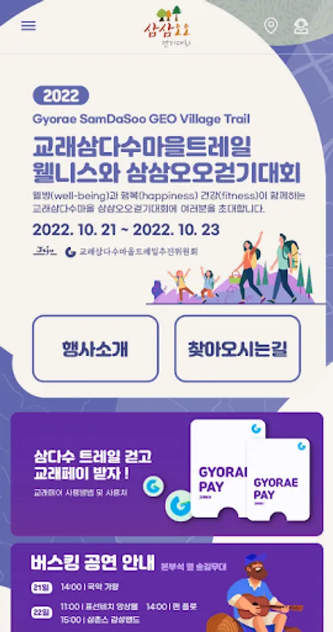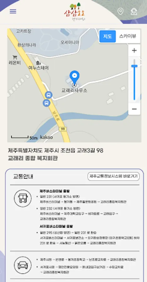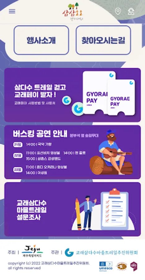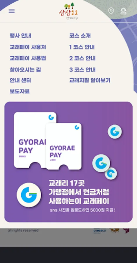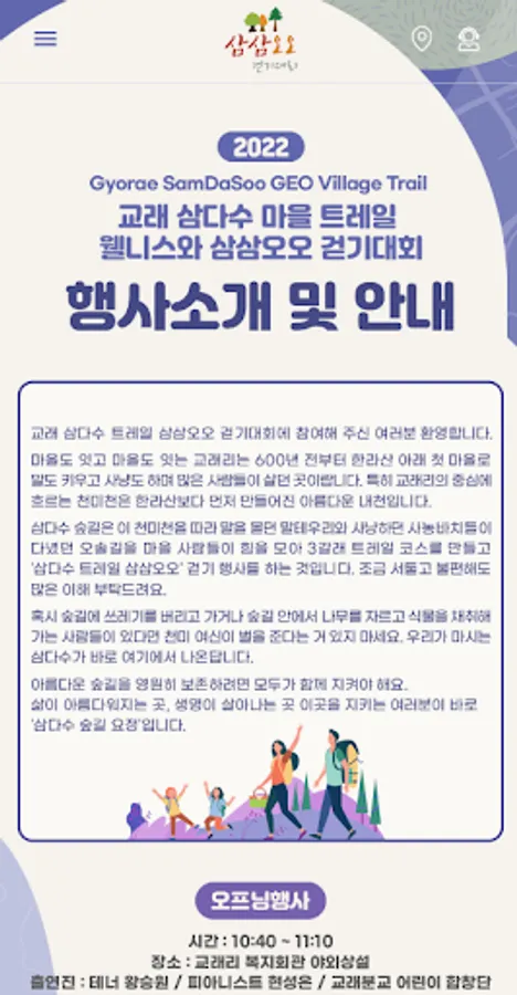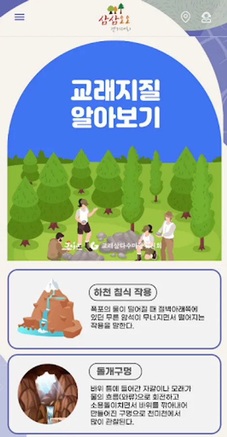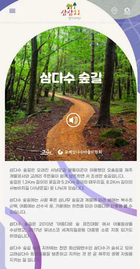 Samdasoo Forest Trail has been designated as the World Natural Heritage Representative Geopark and as the National Geopark, and since 2019, the Gyorae Samdasu Village Geotrail Three-Three Five-Walk Tournament has been held. Gyorae-ri is the first village under Hallasan Mountain 600 years ago, where many people lived and raised horses and hunted. In particular, Cheonmicheon, which flows in the center of Gyorae-ri, is a beautiful Naecheon created before Hallasan Mountain.