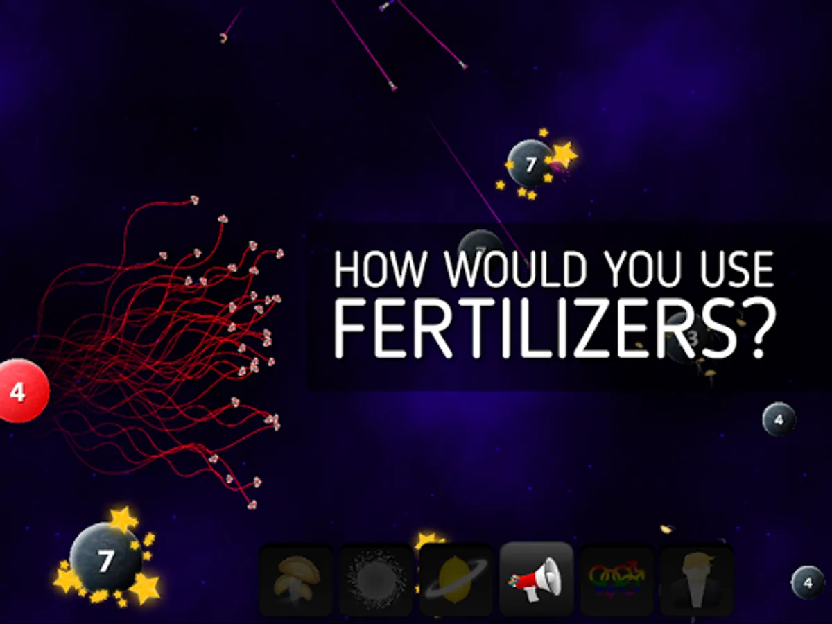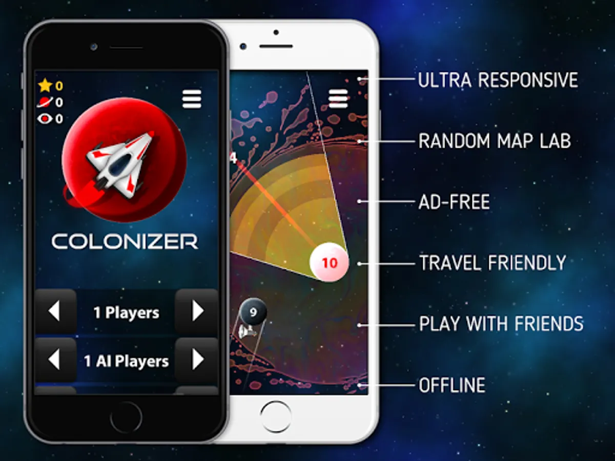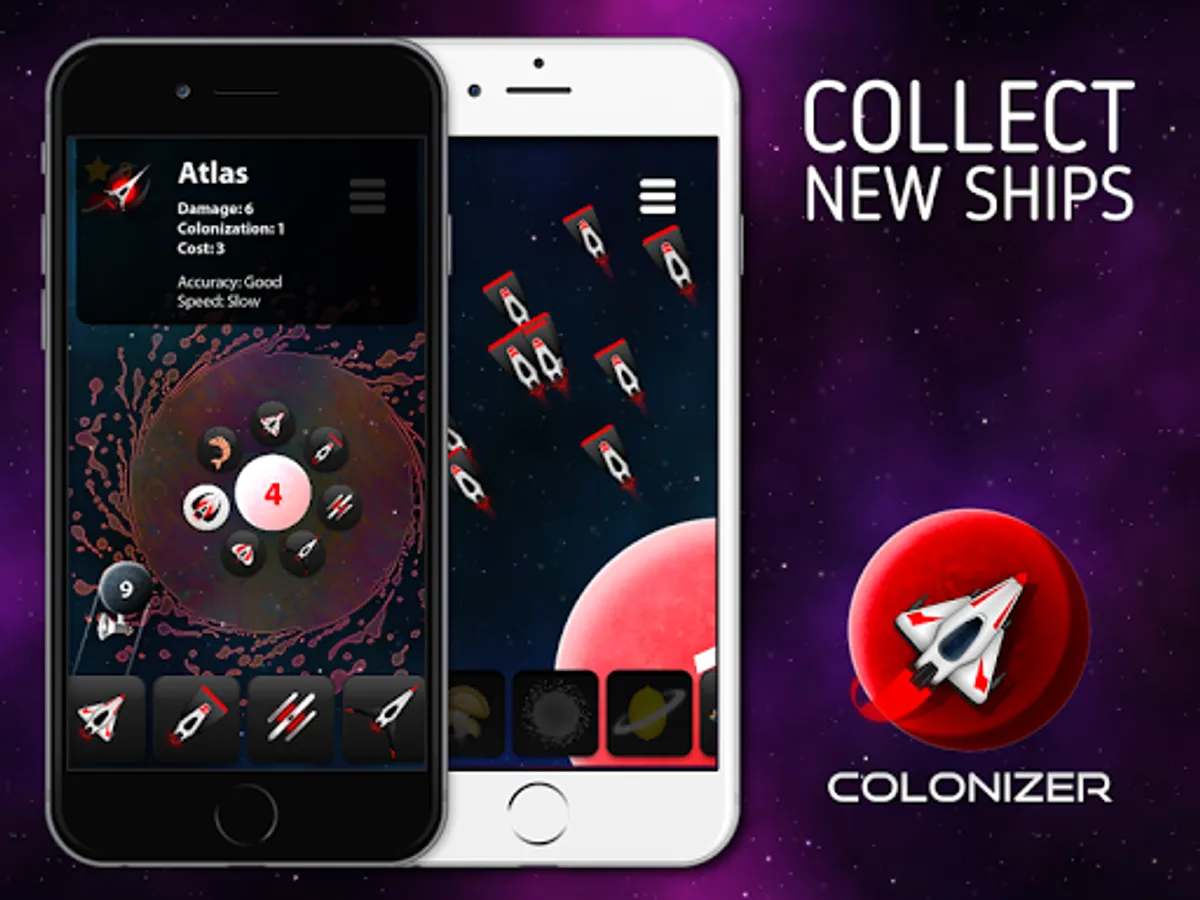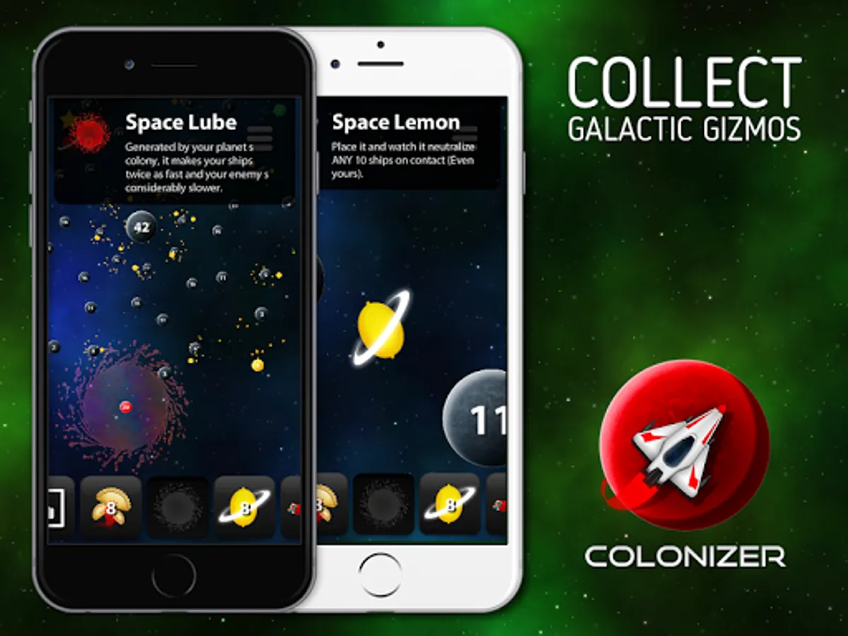 Colonizer is a strategy game set in outer space. You will command a diverse fleet of ships and attempt to claim more planets than your rivals, earning stars that allow access to some of the stranger power-ups that the galaxy has to offer (Floating empanada defense system, anyone?).