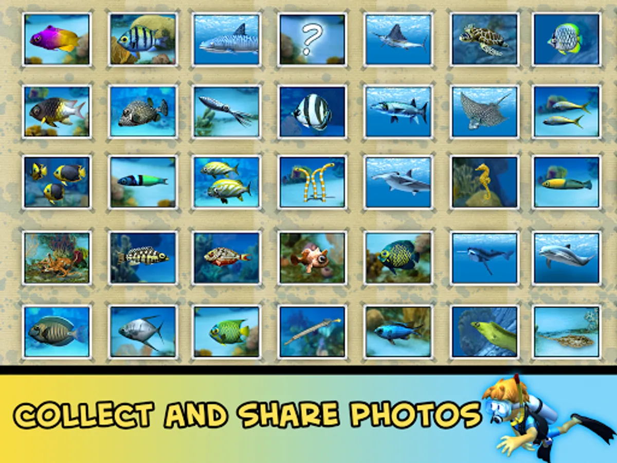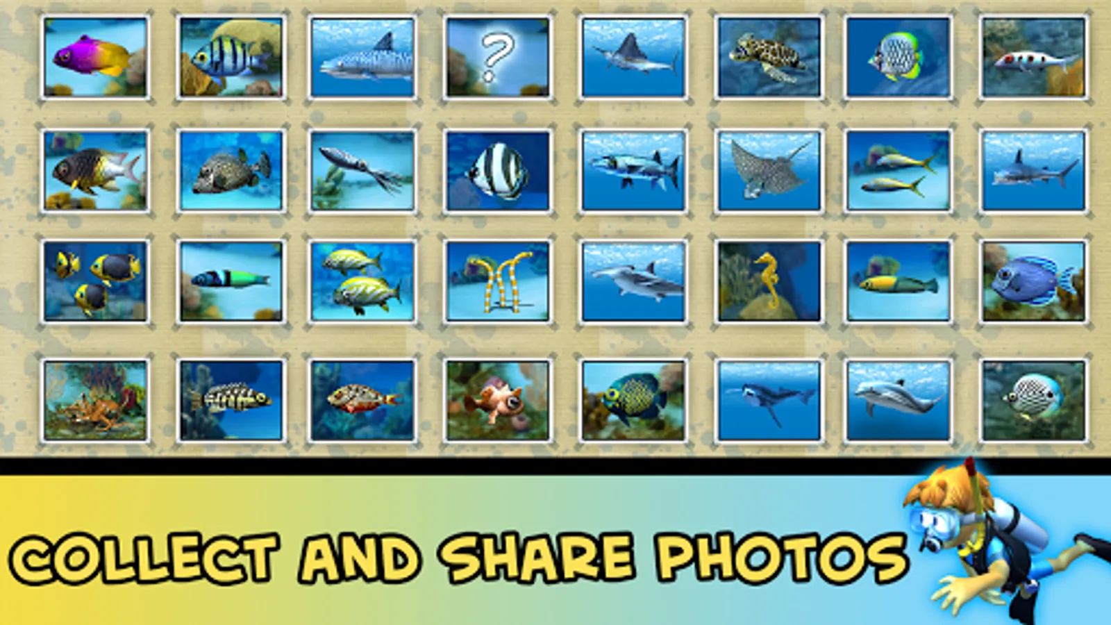 Collect photos of sharks, dolphins, turtles, whales, giant animals, tiny fishes, angry rays! Share your photos with friends and earn extra tips!