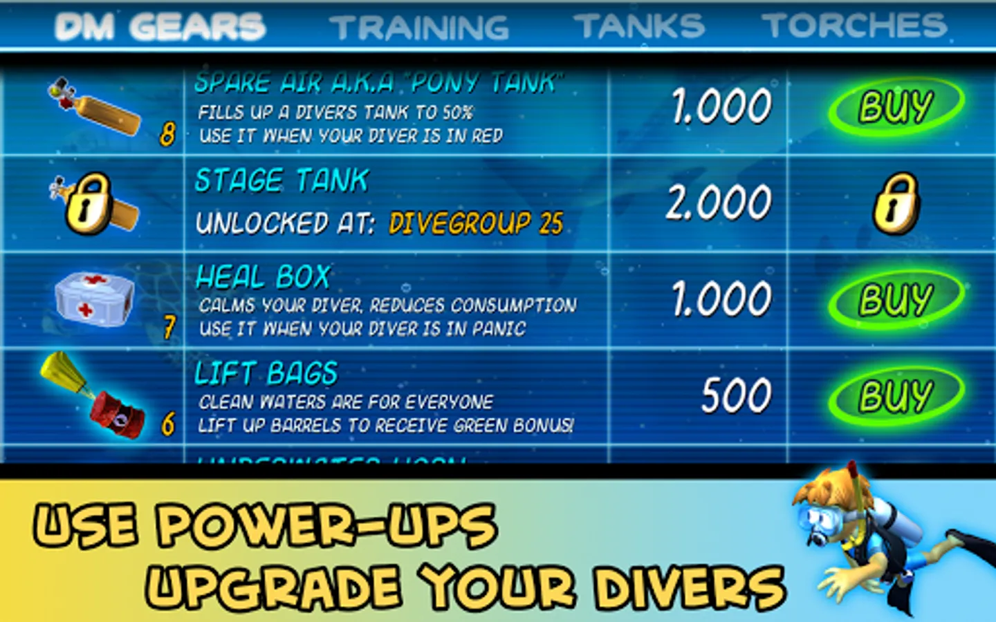 Use coins to upgrade your scuba divers and your skills to be able to discover the ocean. Invite your friends and receive free coins to be spend in the diveshop!