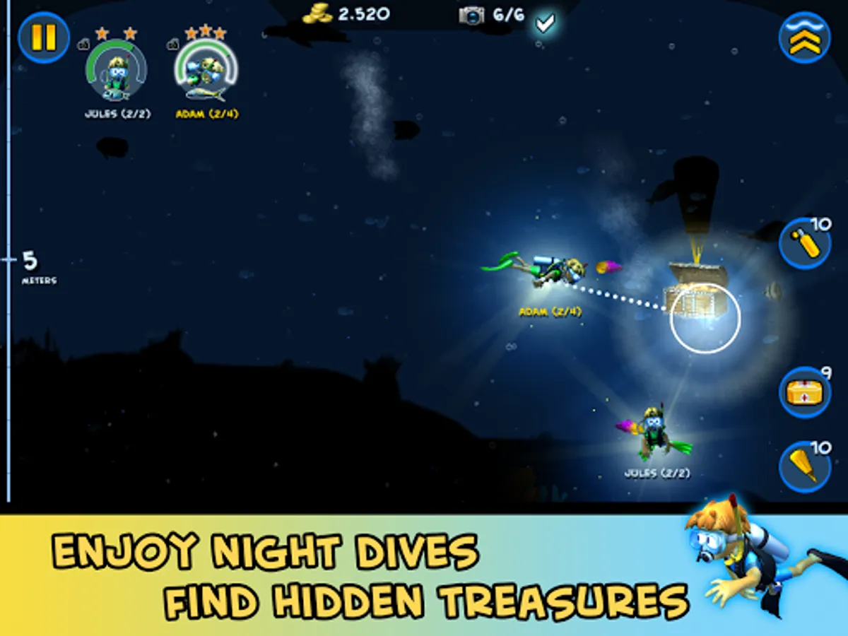 Find and photo with your scubadivers dozens of amazing fishes and animals at the Adventure mode — through day and night dives, from the shallow waters until the extreme depths!