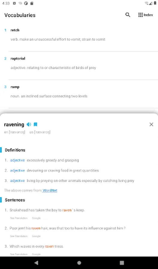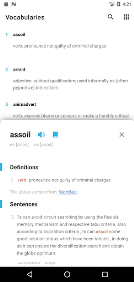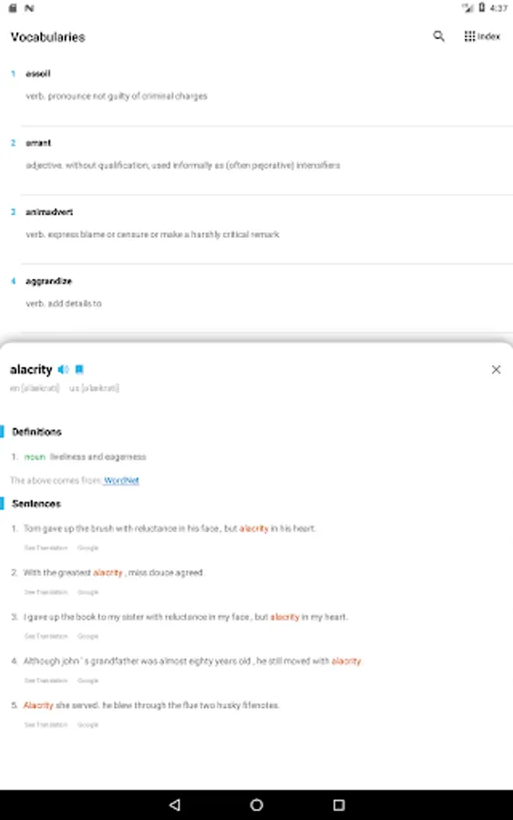 -The example sentences can be translated into the same language as the mobile phone system language via AI, including a shortcut to translate the example sentences via google