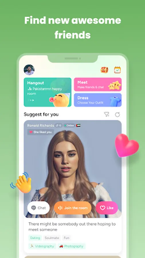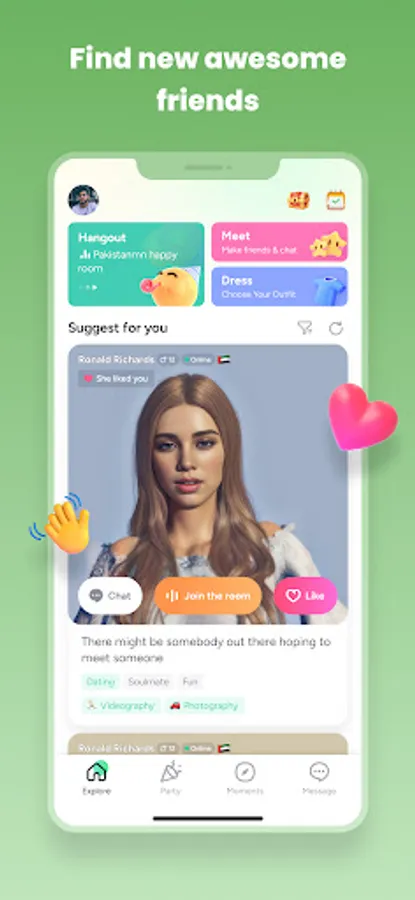 Meet new people, hangout and chat with friends in our 3D live voice chat rooms.