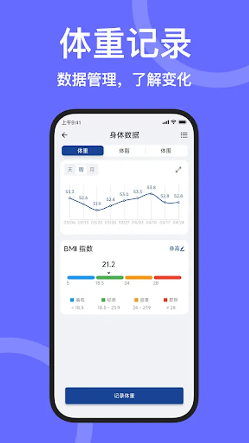 Body data: You can also record your weight, body fat, body circumference, and the way the graph is displayed, so you can easily see your progress.