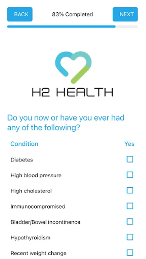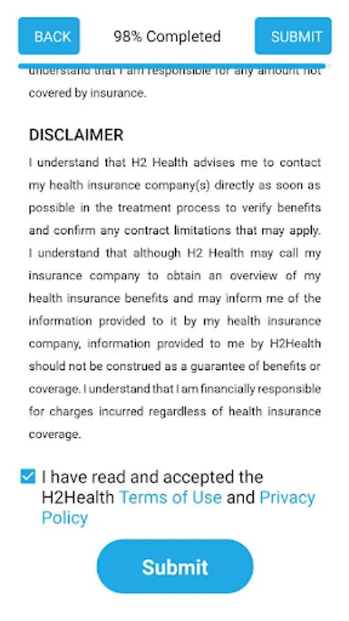 The H2 Health app helps new patients complete all the necessary registration paperwork easily from their mobile device. The app walks the new patient through each step and captures the necessary information for their first appointment with the therapist saving time and providing accurate information. It eliminates the need for new patients to come to their first appointment very early and take time to fill out paper forms on a clipboard by hand.