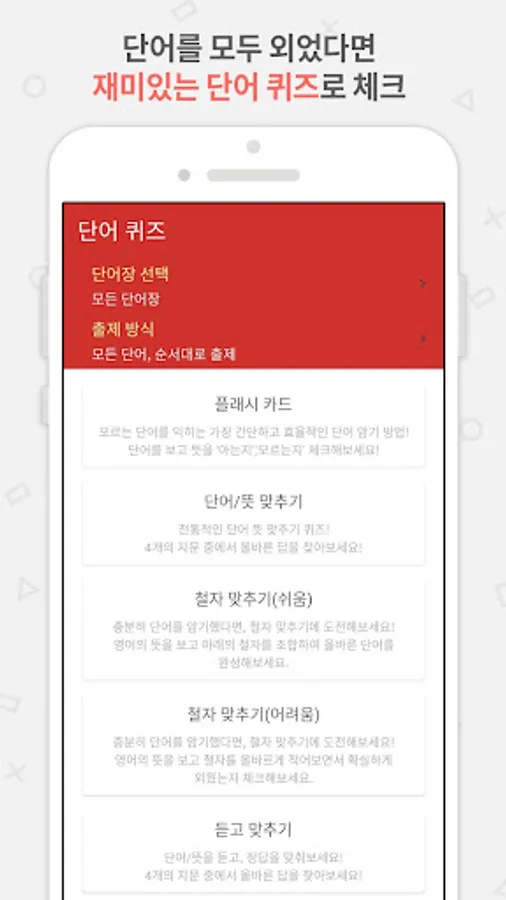 After creating a vocabulary book, it is organized to make it easier to memorize words through various quizzes (flash cards, spelling, matching, etc.).