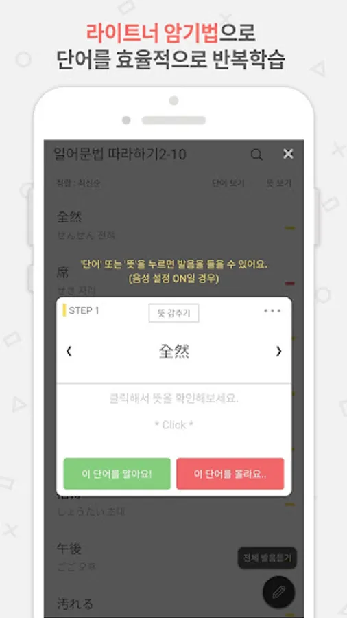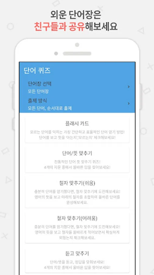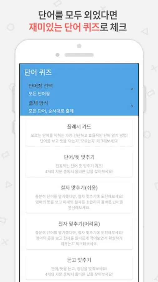 After creating a vocabulary book, it is organized to make it easier to memorize words through various quizzes (flash cards, spelling, matching, etc.).