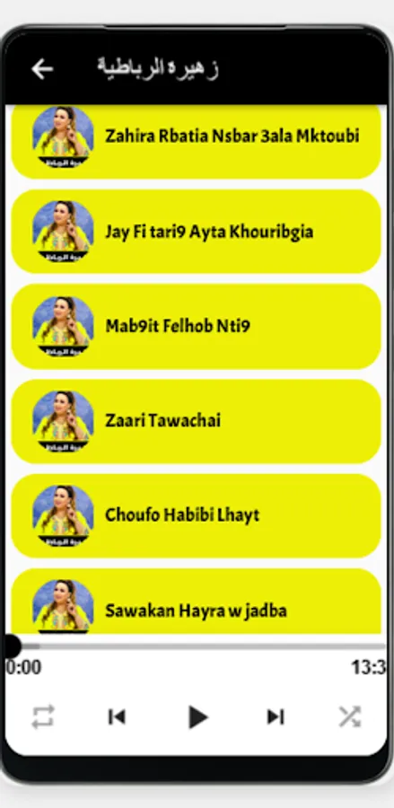 The Zahira Rabati songs application contains the popular Moroccan music of Zahira Rabati. It is a type of Moroccan music, which refers to several types of popular music in Morocco. It appeared in the alleys and market squares as a kind of popular rejection during the period of protection against the colonialists, to later become a voice for the general public expressing their social life, and it was broadcast in cafes, restaurants, and wedding parties.