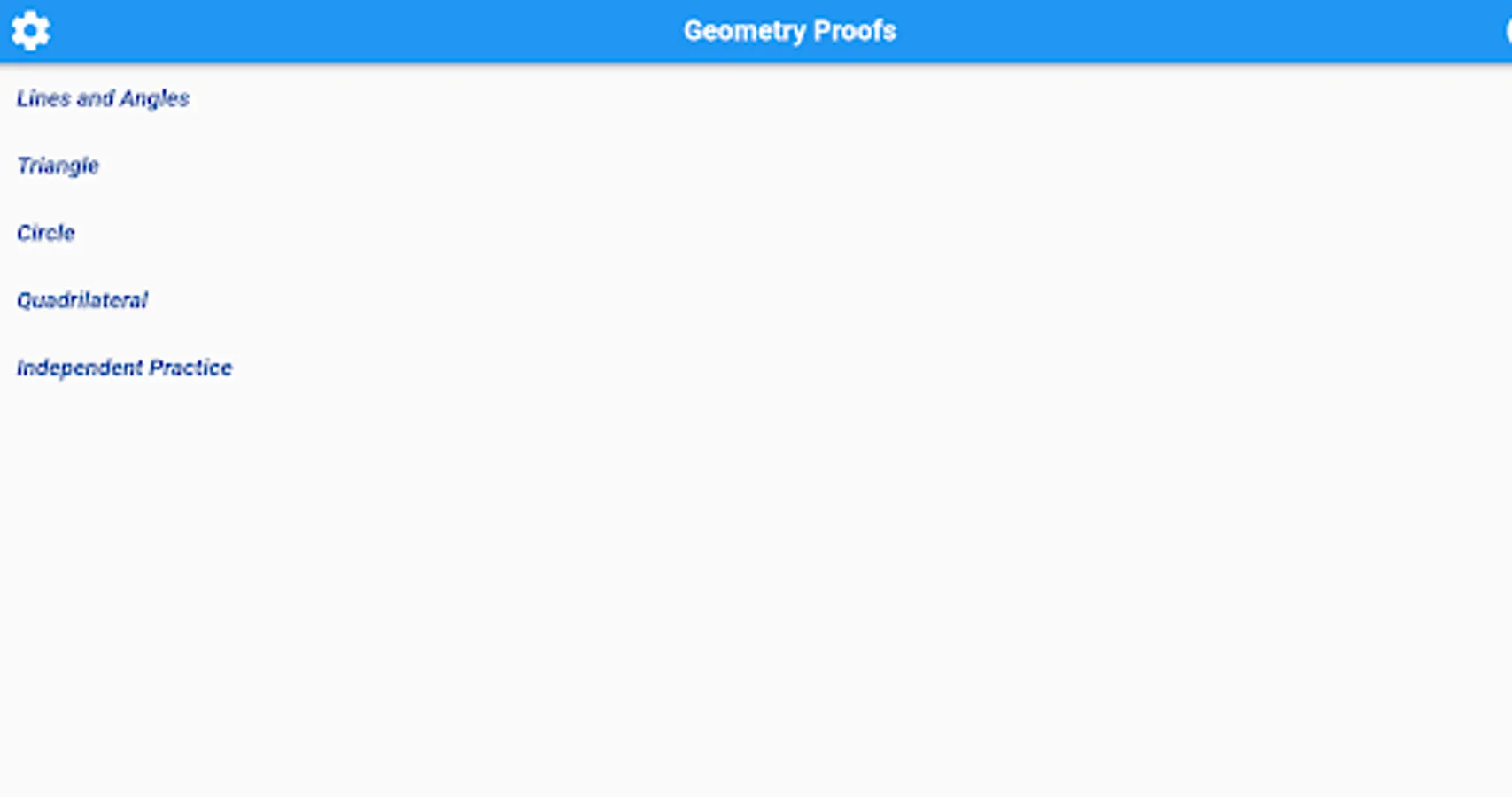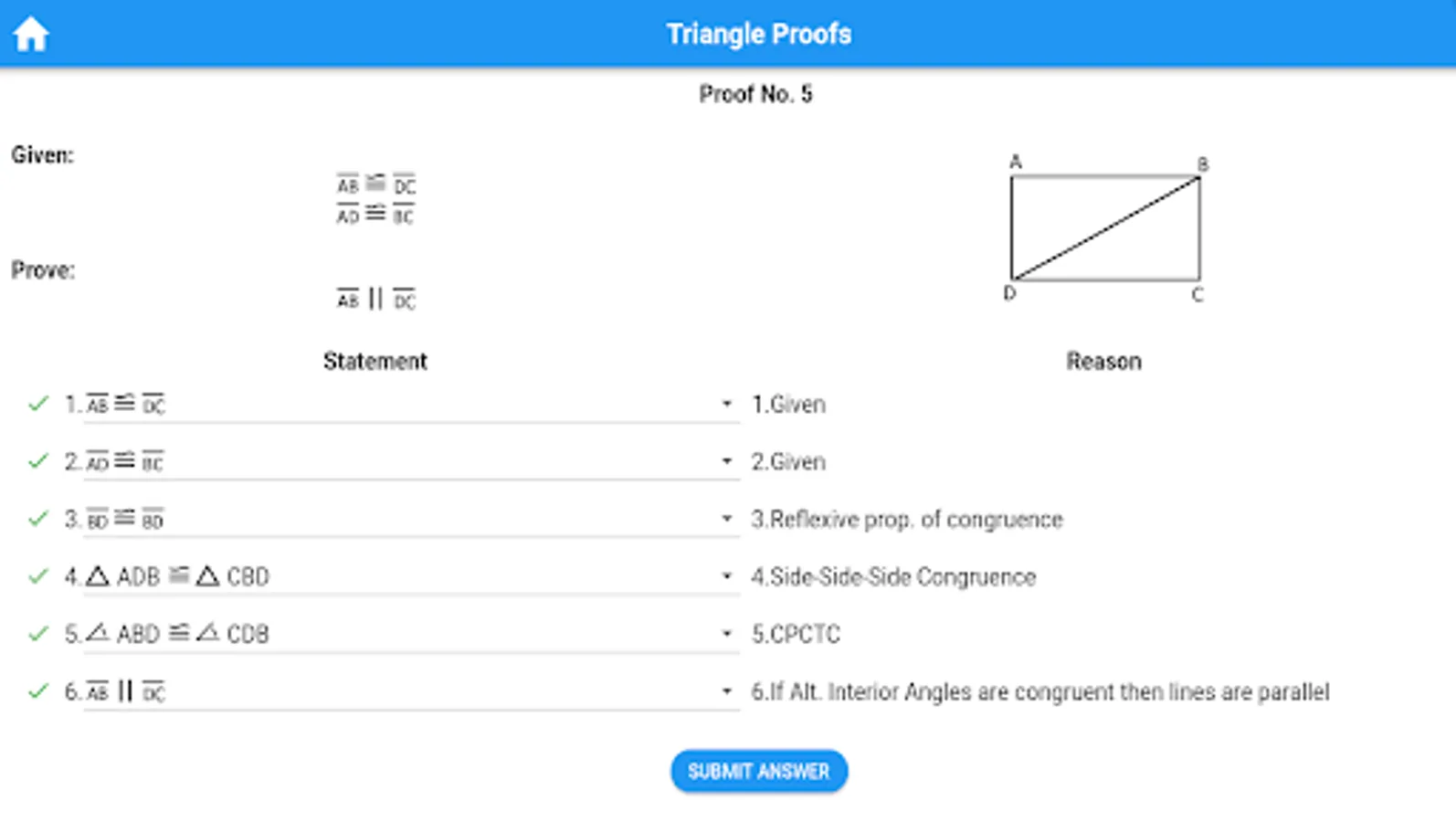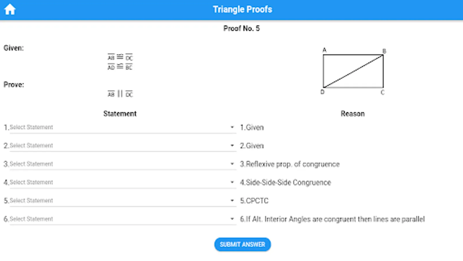 This app includes 45 Two Column Geometry Proofs that you can solve. There are four categories of proofs, Lines & Angles, Triangles, Circles, and Quadrilaterals. You can choose to solve by selecting the Reasons or by selecting the Statements. There are also Independent Practice proofs that you solve yourself and then compare your solution to the answer.