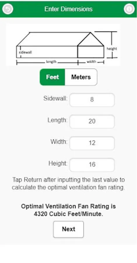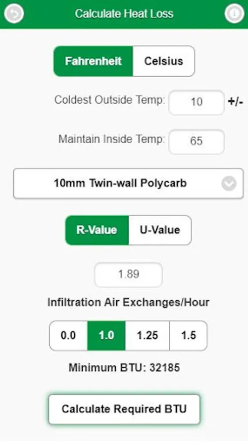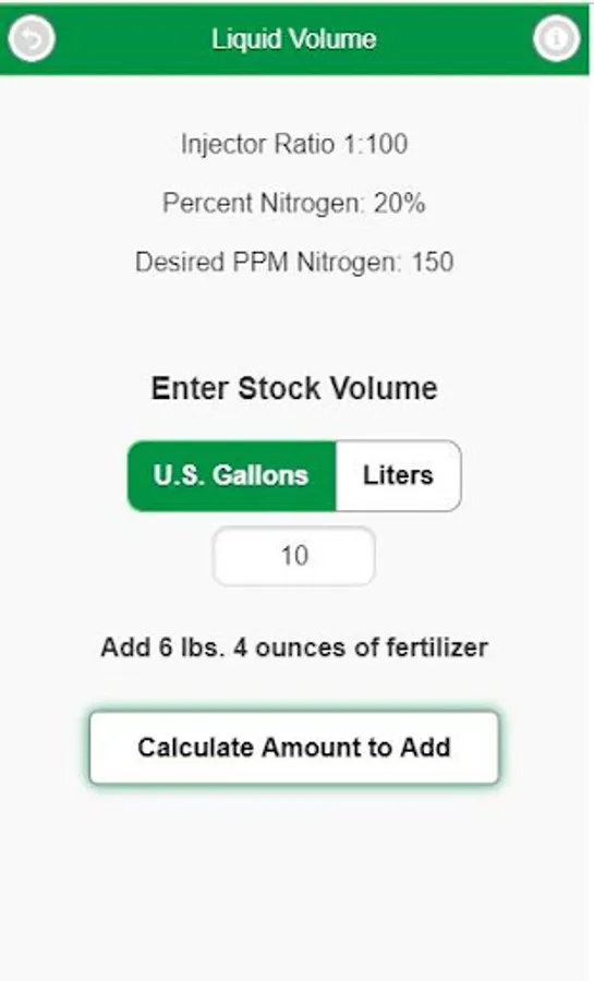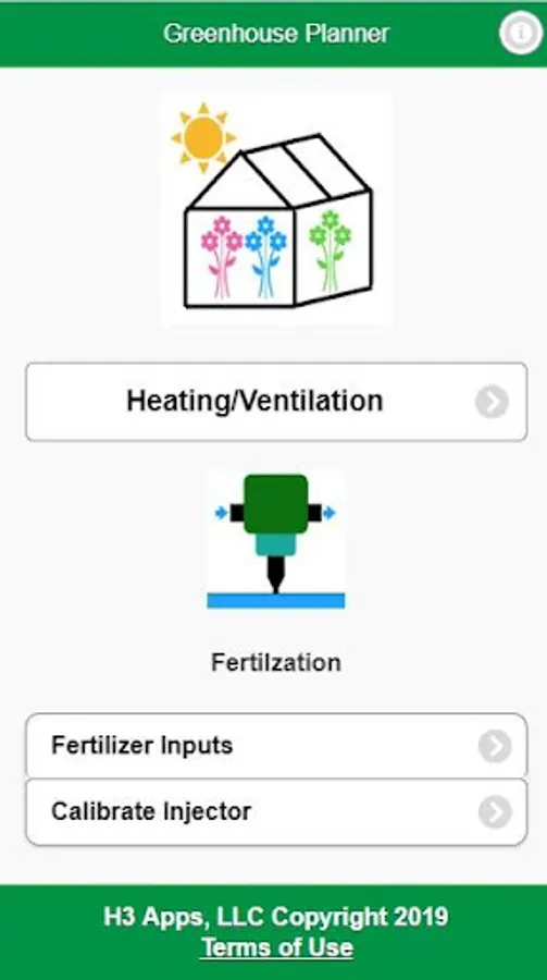 This App includes two tools for Greenhouse planning. The Heating & Ventilation selection finds the optimal ventilation fan rating and heater BTU output requirements for your greenhouse.The Fertilizer selection enables you to determine the right mix of fertilizer nutrient when applying as parts per million using a dilution injector.