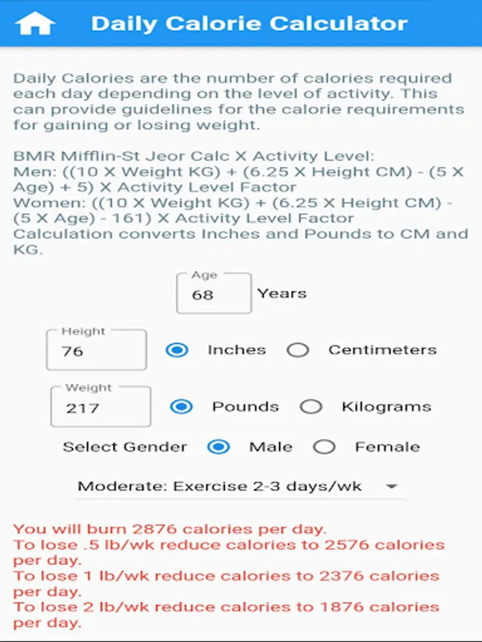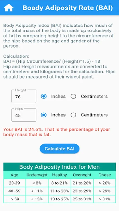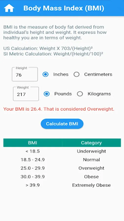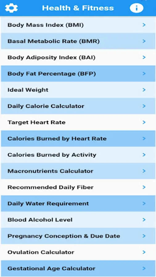 This app includes numerous calculators to measure your Health and Fitness. Among them are Body Mass Index(BMI), Body Metabolic Rate(BMR), Body Adiposity Index(BAI), Daily Calories, Daily Macronutrients, Target Heart Rate, Calories Burned by Heart Rate, Calories Burned by Activity, Recommended Daily Fiber, Daily Water Requirement, Blood Alcohol Level, Pregnancy Conception and Due Date, Ovulation Dates, and Gestational Age.
