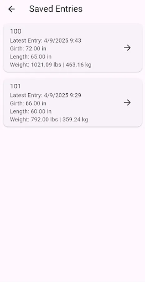 Livestock owners often need to know the weight of their animals in order to determine proper feed rations, to administer the proper dosage of a medication, or to track how individual animals grow. A common tape measure can be used to measure the animal's girth circumference and body length. Using those measurements, the weight is calculated using the formula: Weight = (Girth X Girth X Length)/330 for Imperial units or Weight = (Girth X Girth X Length)/11916.3 for Metric units. Results can be saved for multiple animals and multiple measurements for the same animal to track growth over time.