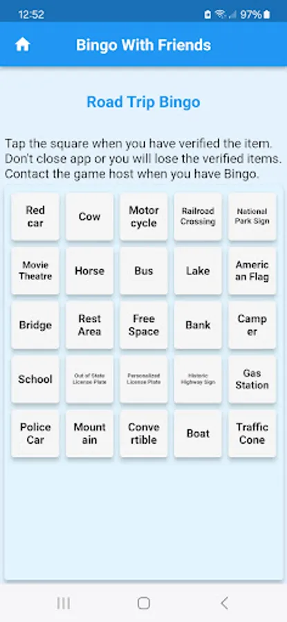 Tired of the same old bingo cards? With Bingo With Friends, you can unleash your creativity by designing your own cards with items tailored to any occasion. Whether it's a road trip, birthday bash, Super Bowl party, or a night out, we've got you covered. Each card is meticulously shuffled, ensuring a unique and exciting experience for every player.