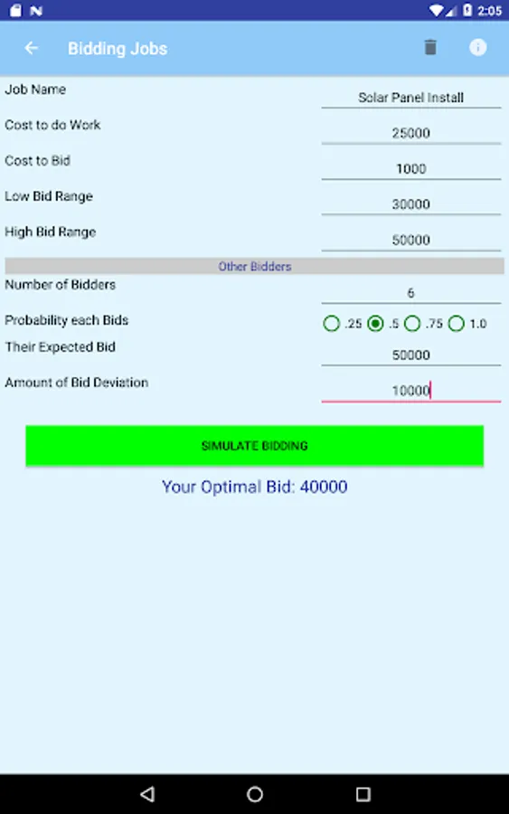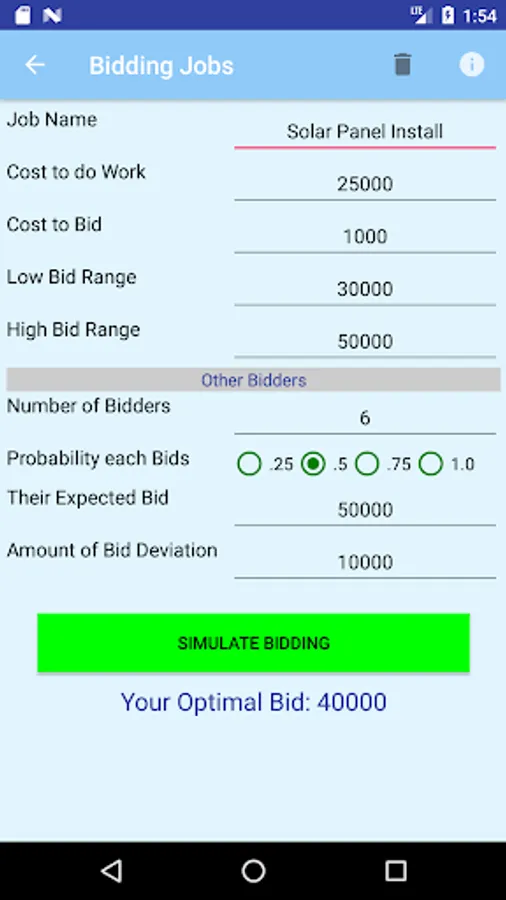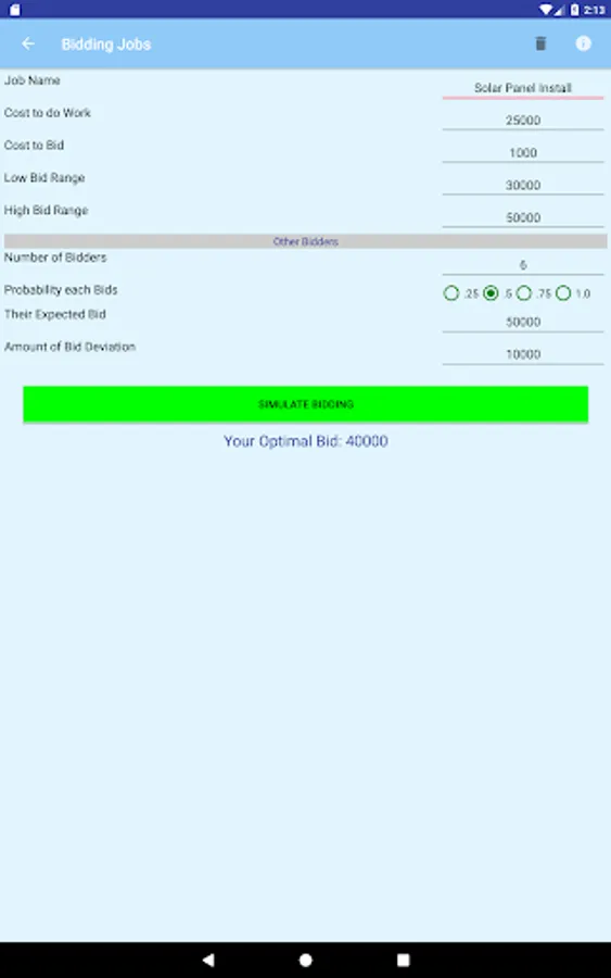 This App helps you make better job bids. When bidding on jobs against competitors, making a high bid yields more profit but decreases the likelihood your bid will win. A low bid yields less profit but increases your chance of winning the job.Somewhere in the middle is the optimal bid that gives you the best chance of winning the job contract while making a nice profit. Using the power of Monte Carlo Simulation this App considers the uncertainty around the number of bidders and their bid proposals in determining the bid you should make that maximizes your expected profit.