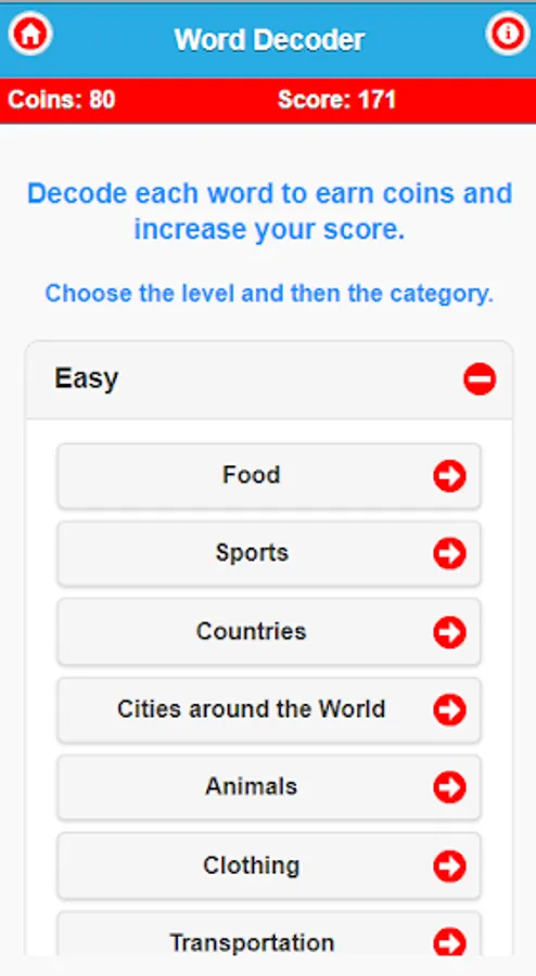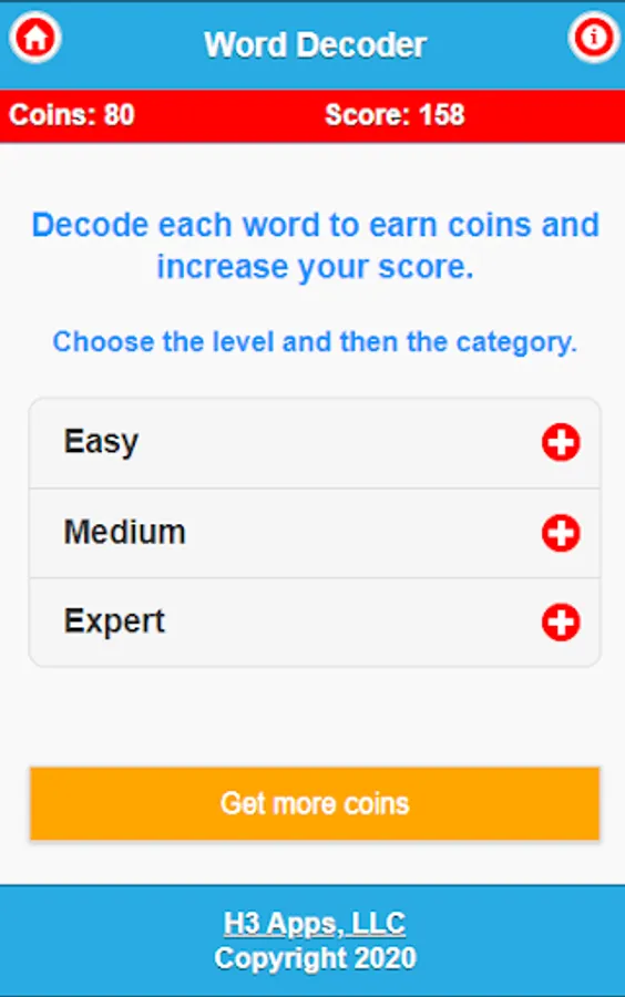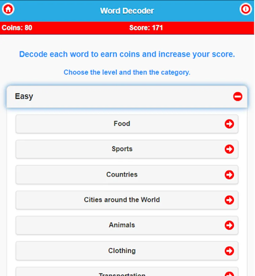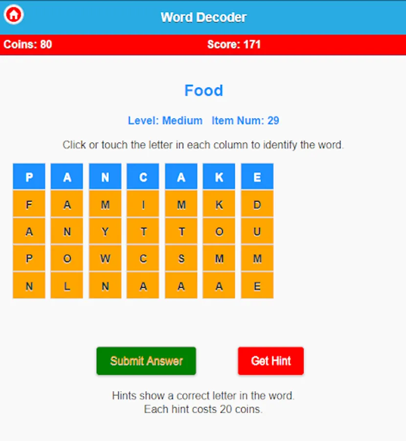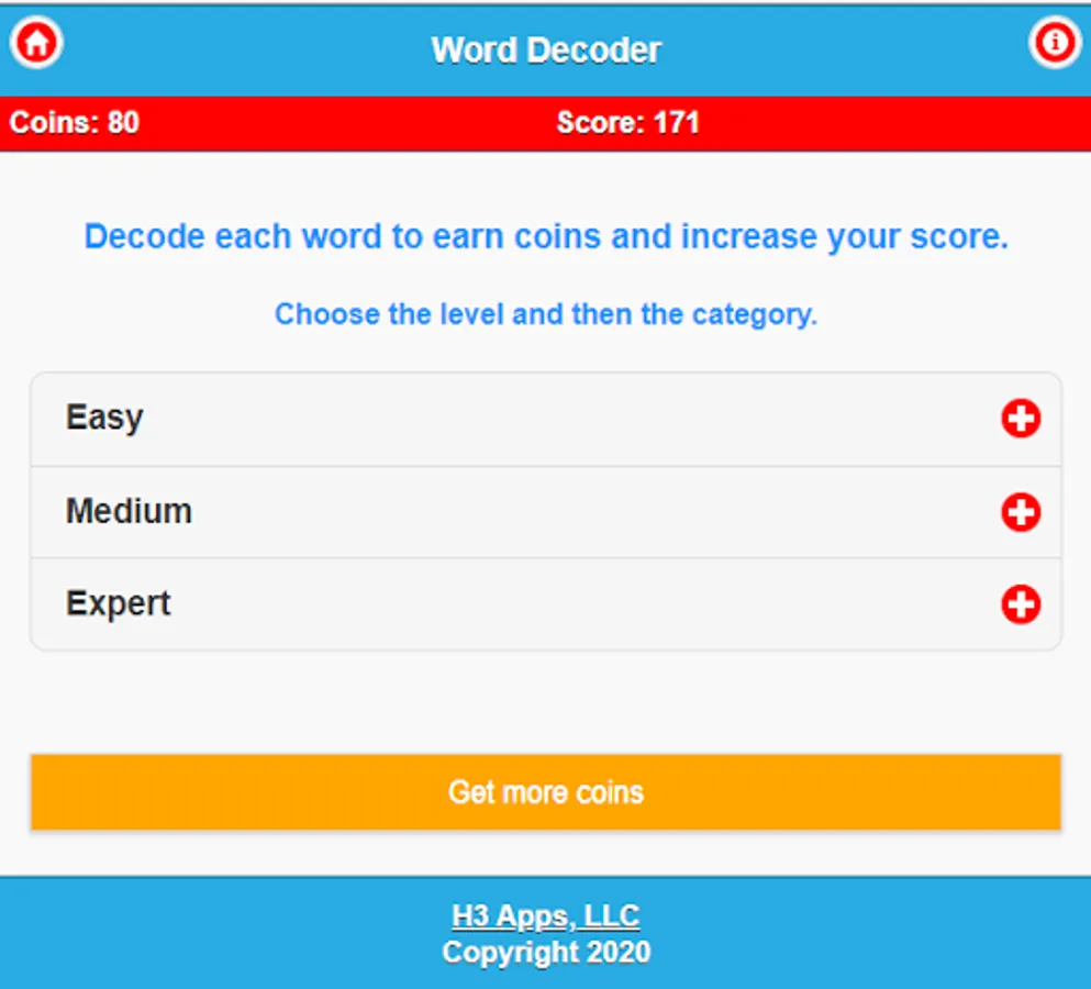 Earn coins and add to your score as you find the correct letter in each column to decode the word. There are three levels of easy, medium, and expert with ten categories at each level. . Use the Get Hint button to show the correct letter in a column. Each word you solve earns coins and increases your score by the number of letters in the word, minus any letters revealed by hints.