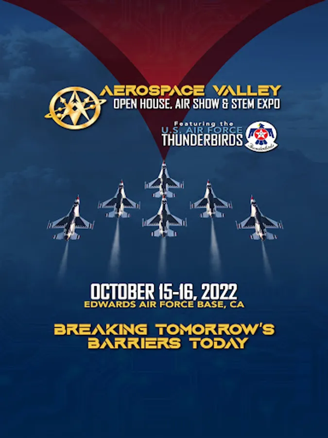 The Aerospace Valley Air Show at Edwards Air Force Base, is an entirely new event dedicated to showcasing the best of STEM and aviation. Organized by the 412th Test Wing, Edwards Air Force Base, this event will be the first open house for the base in 13 years. The weekend consists of a large STEM Expo with nearly 60 hands-on displays and activities, a large air show headlined by the USAF Thunderbirds Flight Demonstration Team, and several surprises you will have to see to believe!