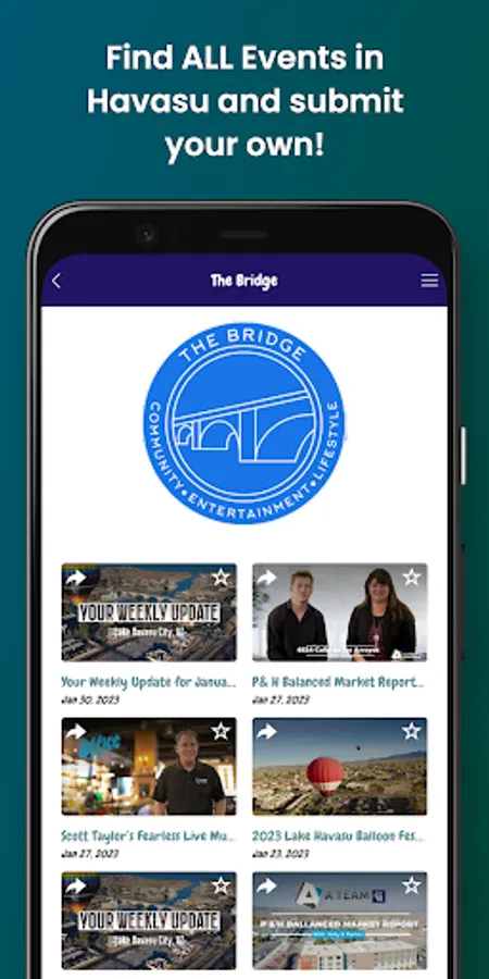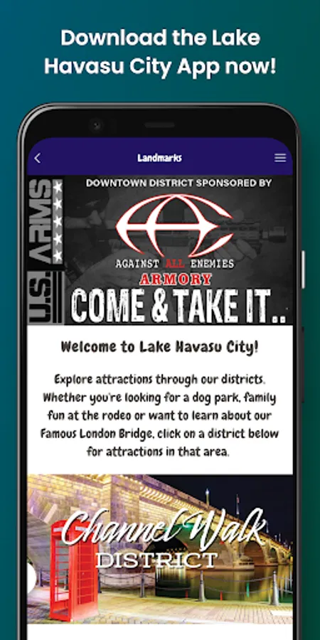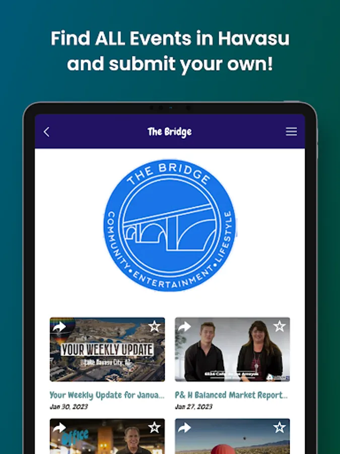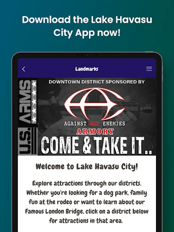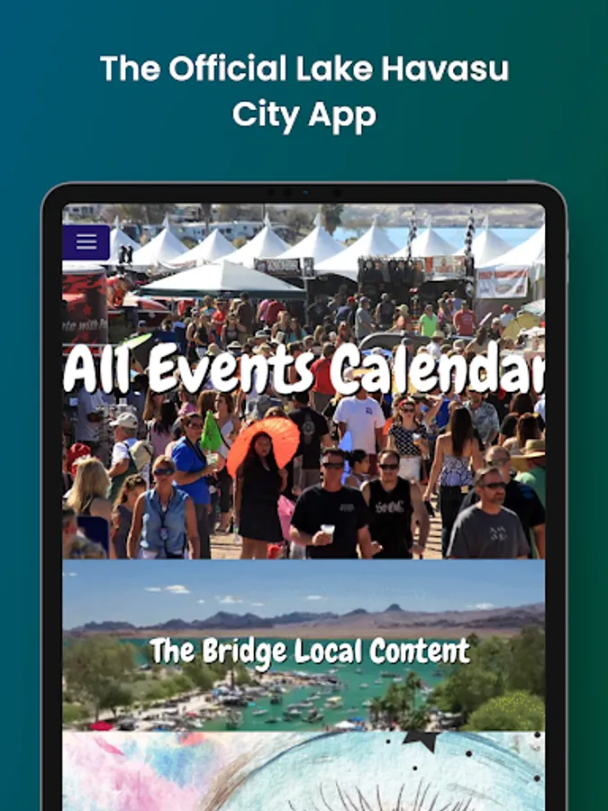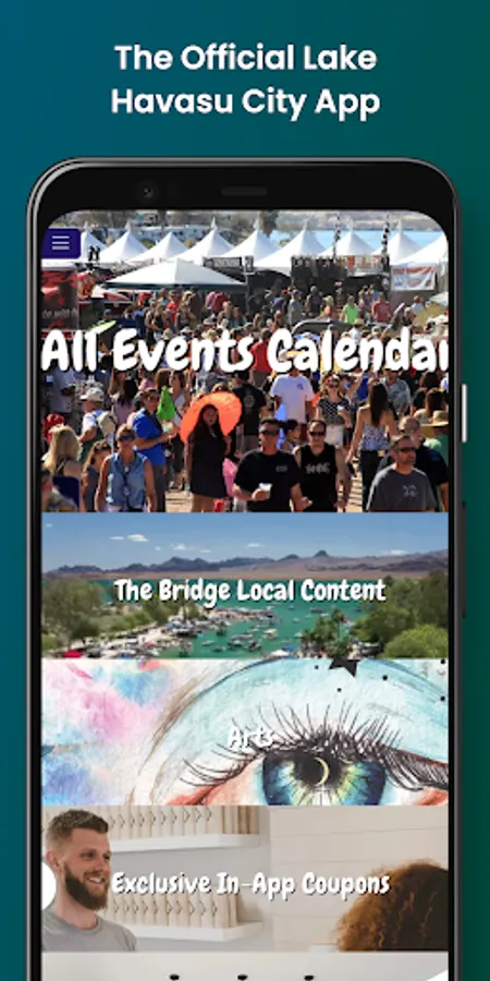 Havasu At Your Fingertips! Get updates on events, explore main attractions, find businesses by location and category and more! The Lake Havasu City App has you covered from coupons, lodging, weather and city-wide updates whether you are a local, a winter visitor or here for the weekend.