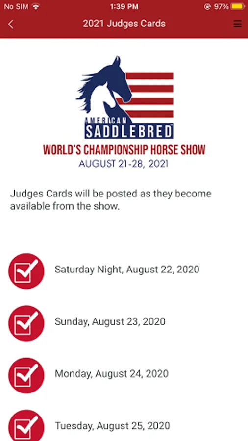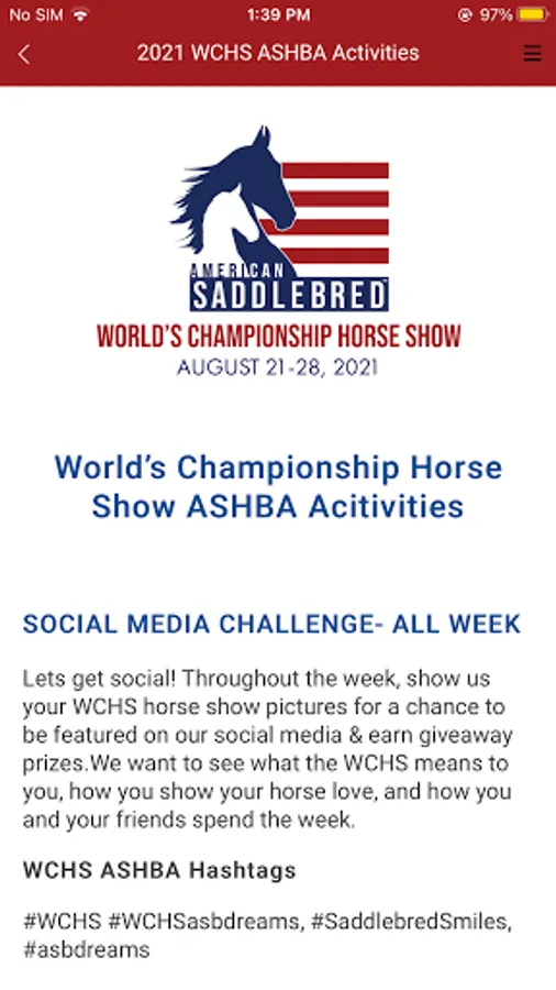 American Saddlebred Horse Associations' membership, exhibitors, horse trainers and general audience are welcome to use the app. The app's main purpose is to provide entries and live results at the World's Championship Horse Show. The app will provide the ability to search by classes, trainers, horses and exhibitors, publish Judges' cards, over the air announcements of split and class changes, youth activities listings, vets & farriers contacts and much more.