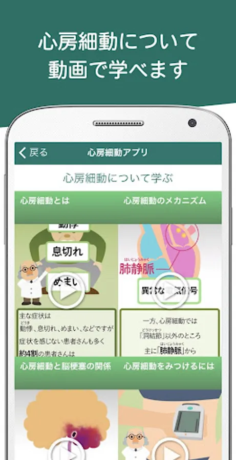 Since there are many explanations about anticoagulant therapy in the examination room, even if the explanation is understood at the time of explanation, the memory may become vague later, and the correct knowledge may not be shared with family members and caregivers. I think there is. In this app, you can learn about the disease, such as why atrial fibrillation is a risk of cerebral infarction and the side effects of taking medication, in an easy-to-understand manner through videos.