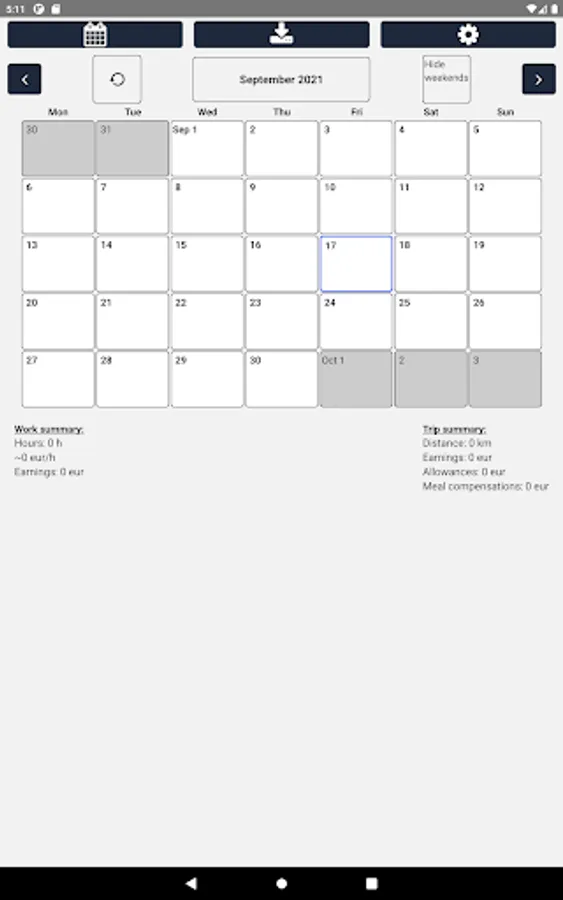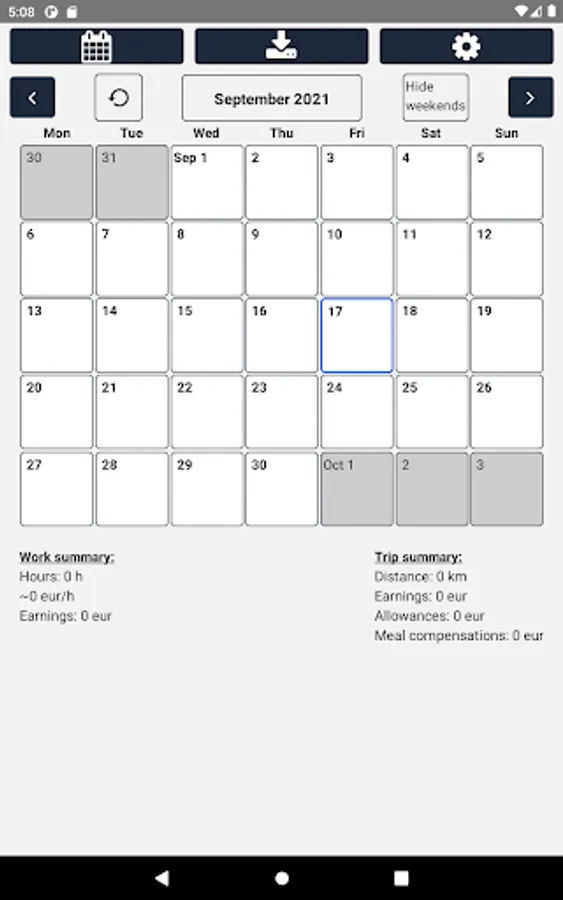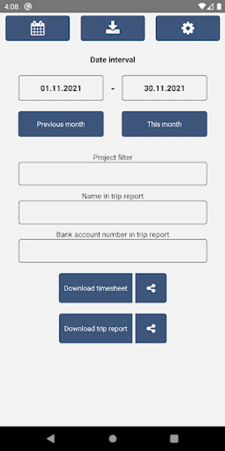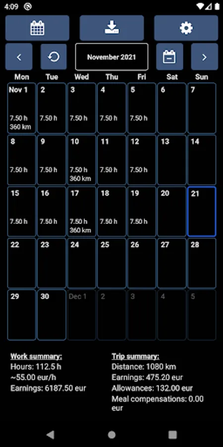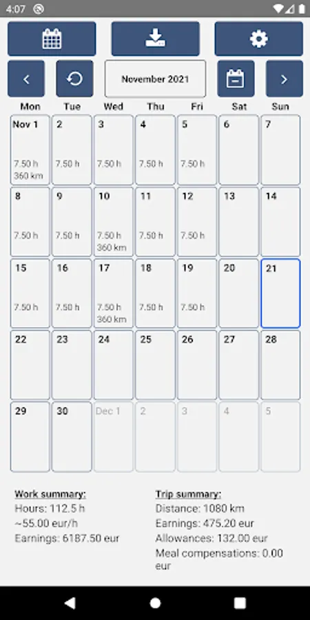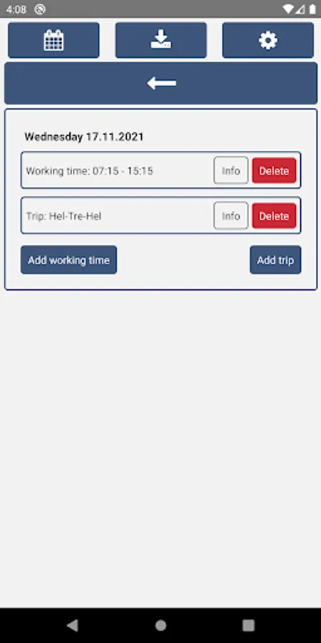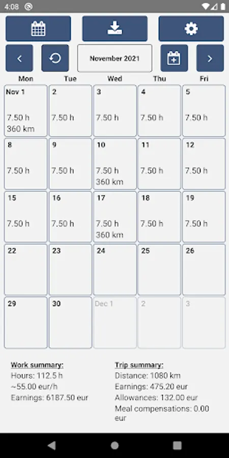 Record your working hours and trips. Download Excel reports directly to your phone or share the report to e.g. Google Drive or email.