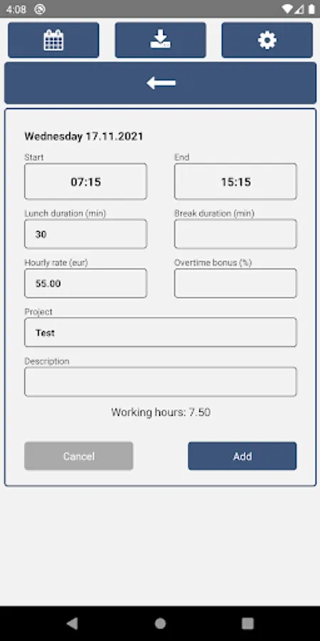 Add working hours for multiple projects including lunch and break duration, hourly rate, overtime bonus, and descriptions.