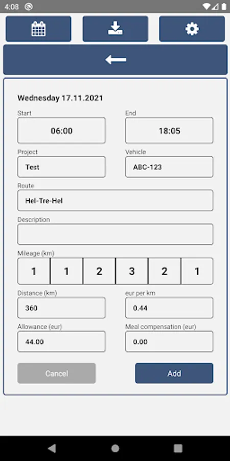 Add working trips for multiple projects including vehicle license, route, description, mileage, distance, compensation per km (or mile), with daily allowance and meal compensations.