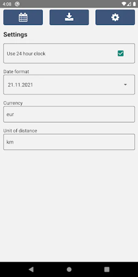 Define currency, 24-hour or 12-hour clock and unit of distance for trips.