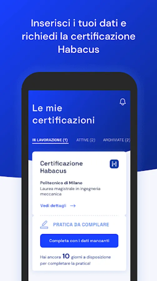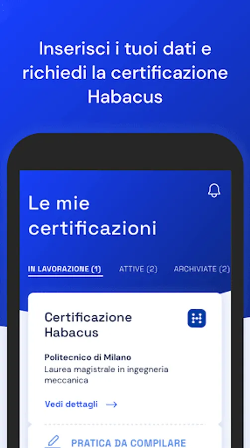 To start a Habacus certification request, all you have to do is enter your personal data, information on the course of study you intend to attend or are already attending, and upload the documents required for certification. You will complete the procedure by sharing your identification document and affixing an advanced electronic signature.