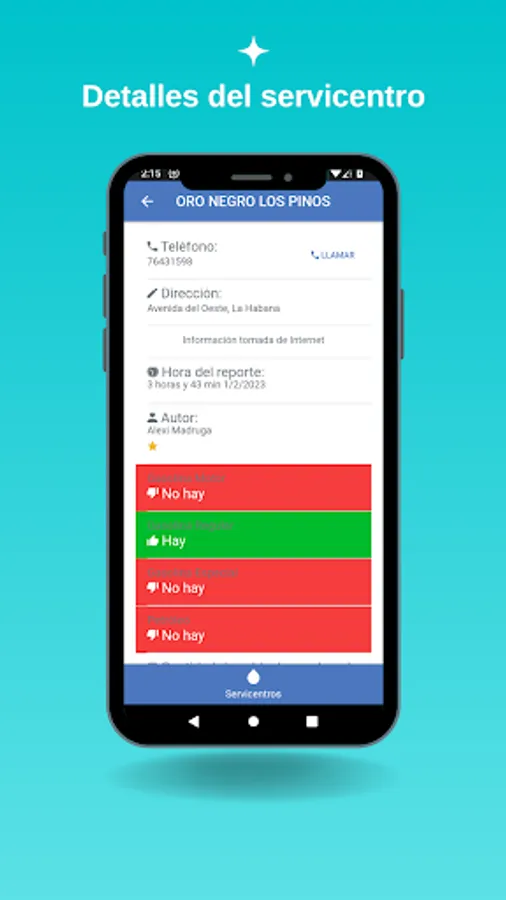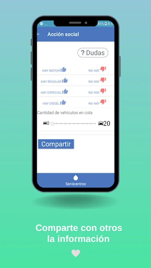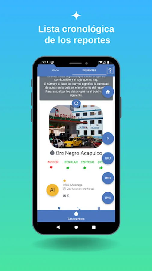 To guarantee the reliability of the data, it is only possible to share it if the driver is within a radius of 50 meters from any service center, the application will search for the closest one and if it is within that range, it will transmit the selected data. The user receives the data easily by pressing the icon of the desired service center on a map or by a list where the reports are organized chronologically, they are also displayed along with the data on the types of fuel, the number of vehicles in the queue, the time of the report and the name of the driver who shared and the phone number of said service center with the possibility of calling him directly from the app.