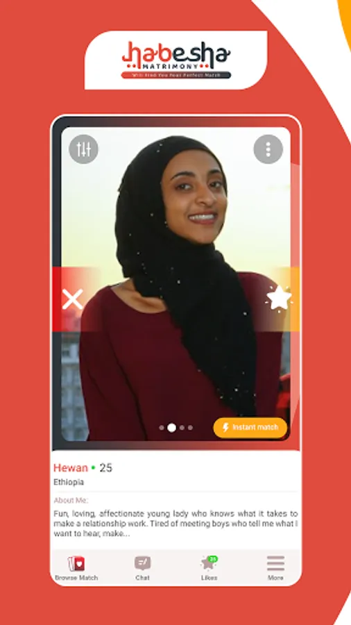 Habesha Matrimonying is easy and fun as Swipe. Match. Chat. Date. Moreover, get married. Swipe Right and left to like someone or to pass respectively. We call it match if someone likes you back.