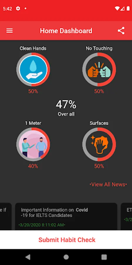 HEALTH HABITS is a new app designed to help you achieve personal habits that can keep you safe. The first set of habits our developers will help you with are the publicized habits that best prevent infection from contagious diseases. HEALTH HABITS is mom recommended! In a simple and nagging way (like a loving mom), HEALTH HABITS sends you alerts to check on your habit formation. Track your progress in building these good habits in the HEALTH HABITS dashboard. HEALTH HABITS also includes a live news feed so you can stay informed with the latest news and best practices to combat the current health crisis. Be safe! Translate good knowledge into good habits with the HEALTH HABITS app. Let HEALTH HABITS help you, your family, and your community achieve key habits that are known to keep you safe! HEALTH HABITS is an app project of G-Force, a Business Automation, entrepreneurship and app development company www.gforceacceleration.com. Contact us at info@healthhabits.tech