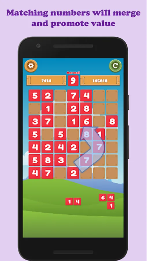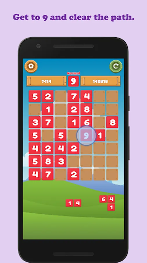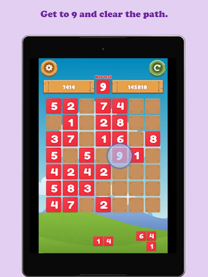 In this number puzzle game, the objective is to establish a path to 9 using the number groups given at the bottom of the screen.