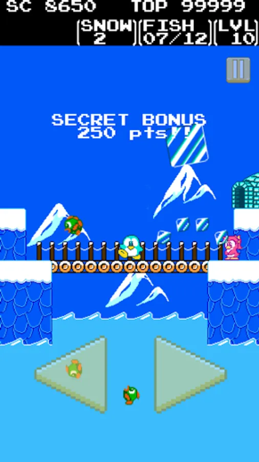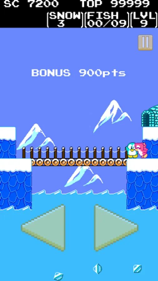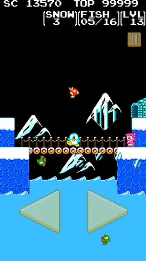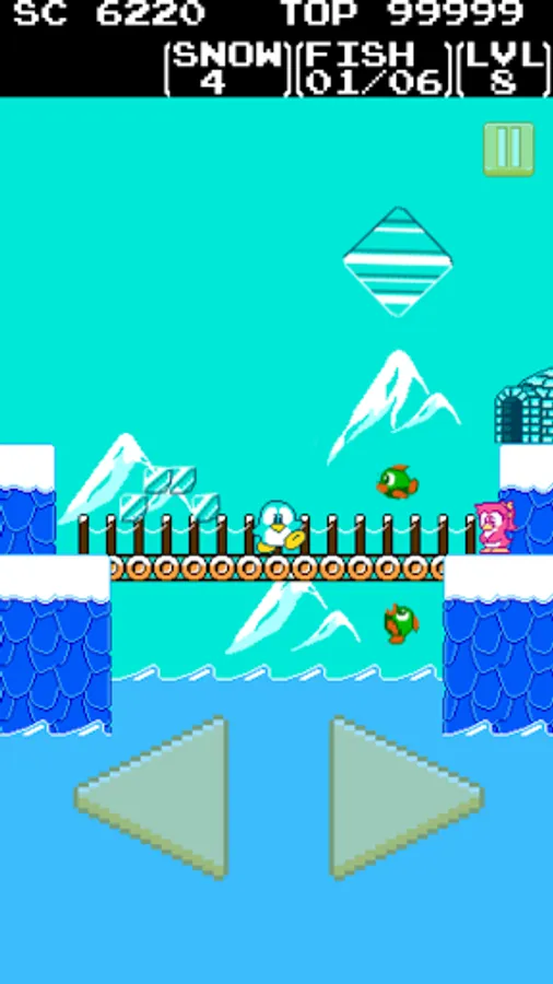 Help penguin Snow to collect the amount of fish requested by his wife Yuki for dinner. Beware of ice cubes falling and piranas jumping from the river!