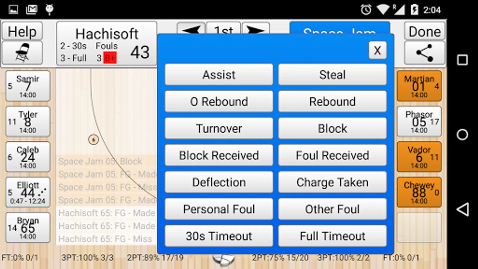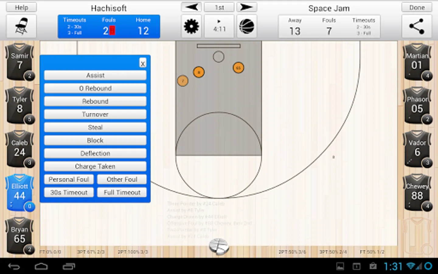 - Trackable stats: rebounds, assists, blocks, steals, deflections, turnovers, charges taken, fouls received, fouls committed, possessions, and more.