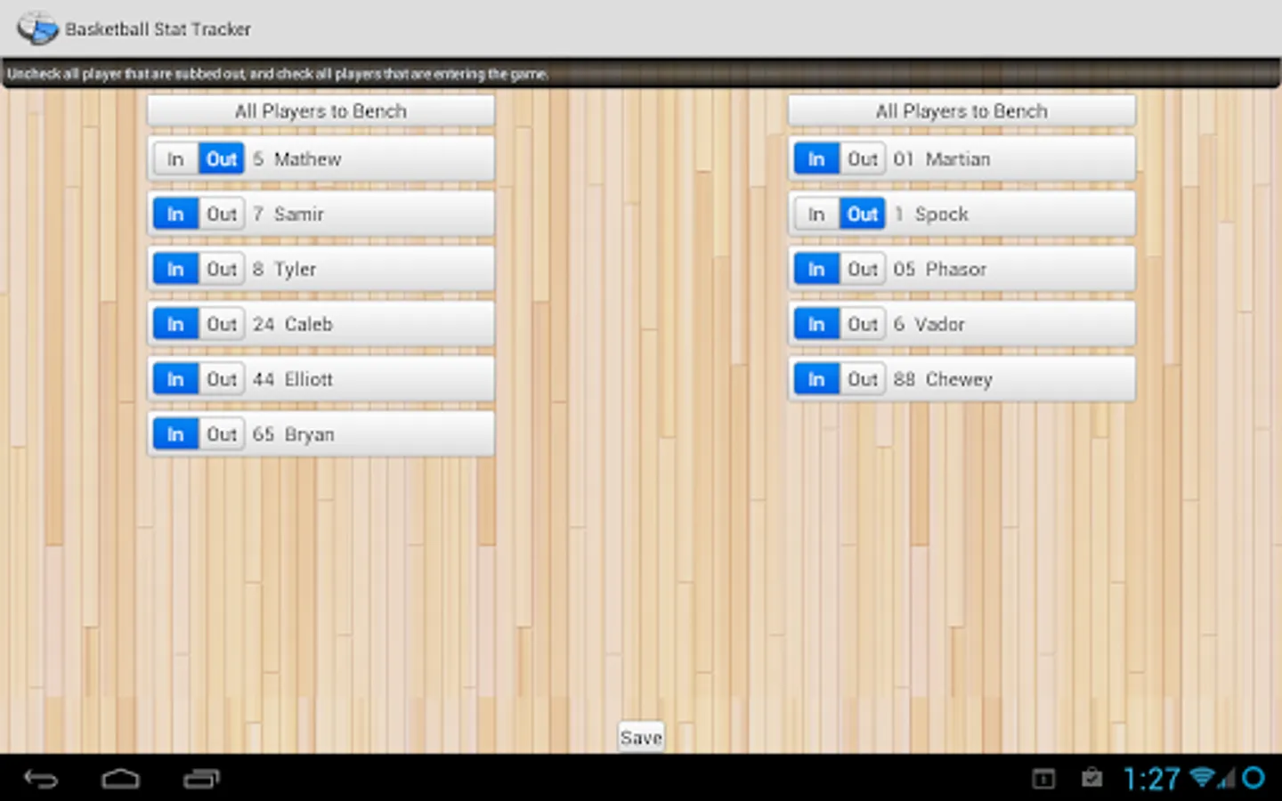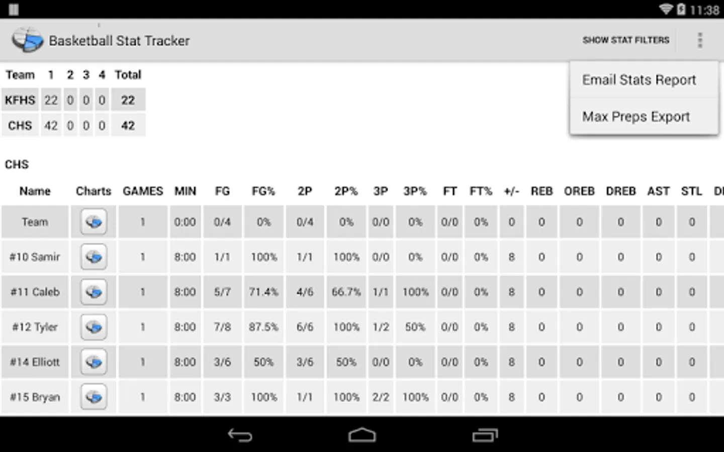 Basketball Stat Tracker takes basketball statistics to a new level. Coaches, scouts, parents, and fans can use Basketball Stat Tracker to track, review, and share statistics from fast paced games. Basketball Stat Tracker takes your stats tracking beyond the traditional pen and paper stat books and makes them available whenever you have your Android device in hand.