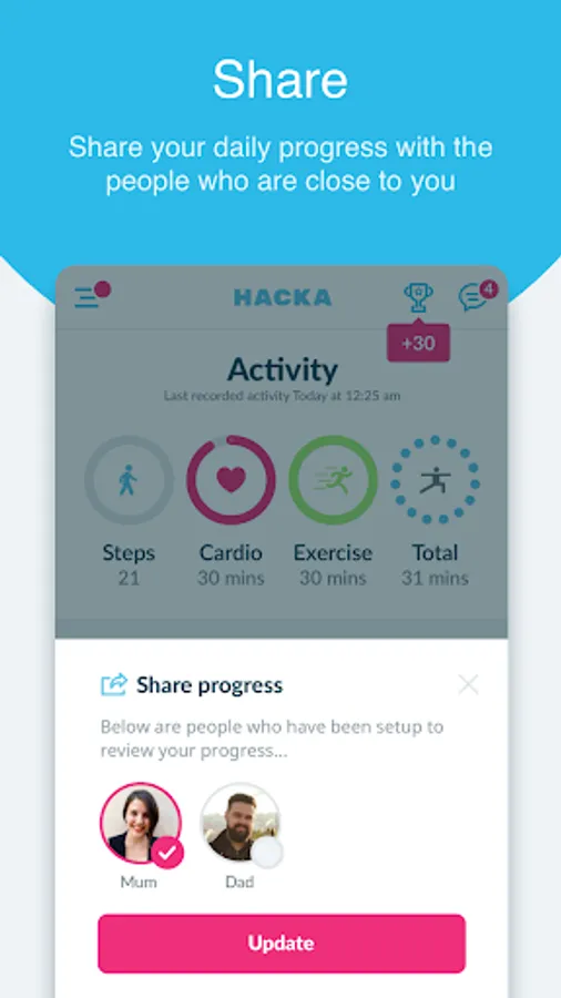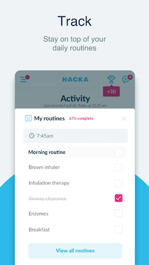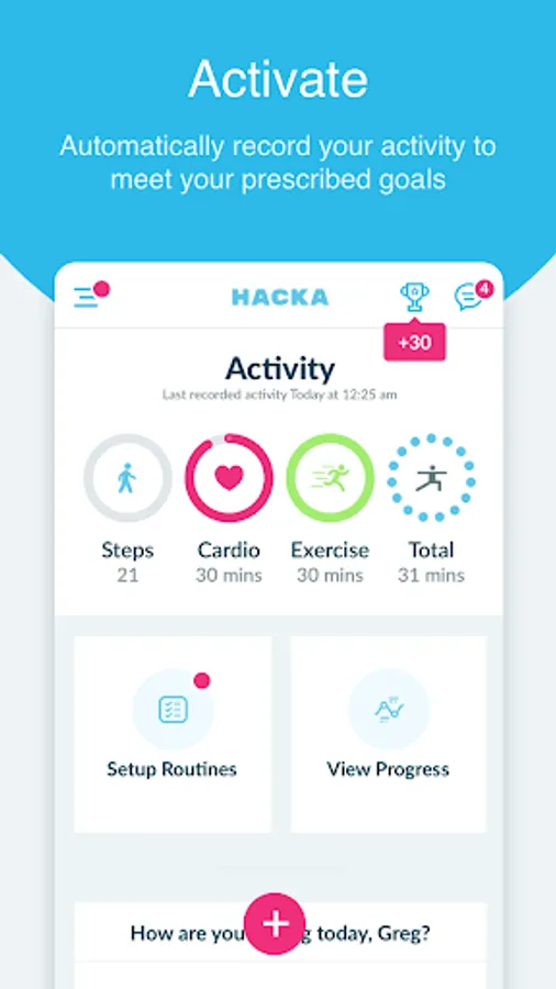 As soon as you have completed the initial setup, you can create daily routines which help to make your day that bit easier. Hacka Health can automatically track your physical activity and cardiovascular exercise from popular apps and wearables. This will show you if you are on track to complete your daily targets set by your healthcare team.