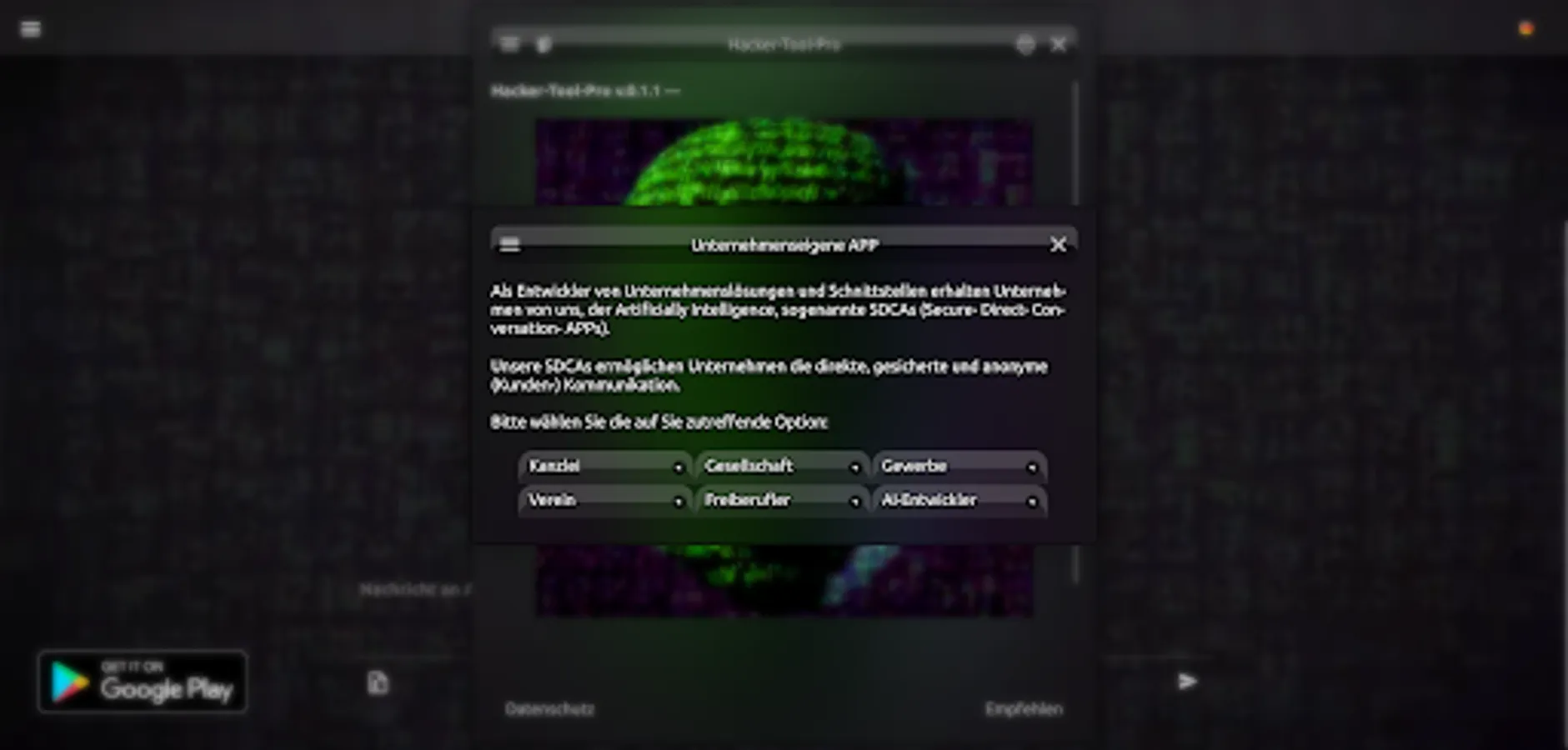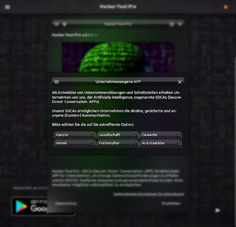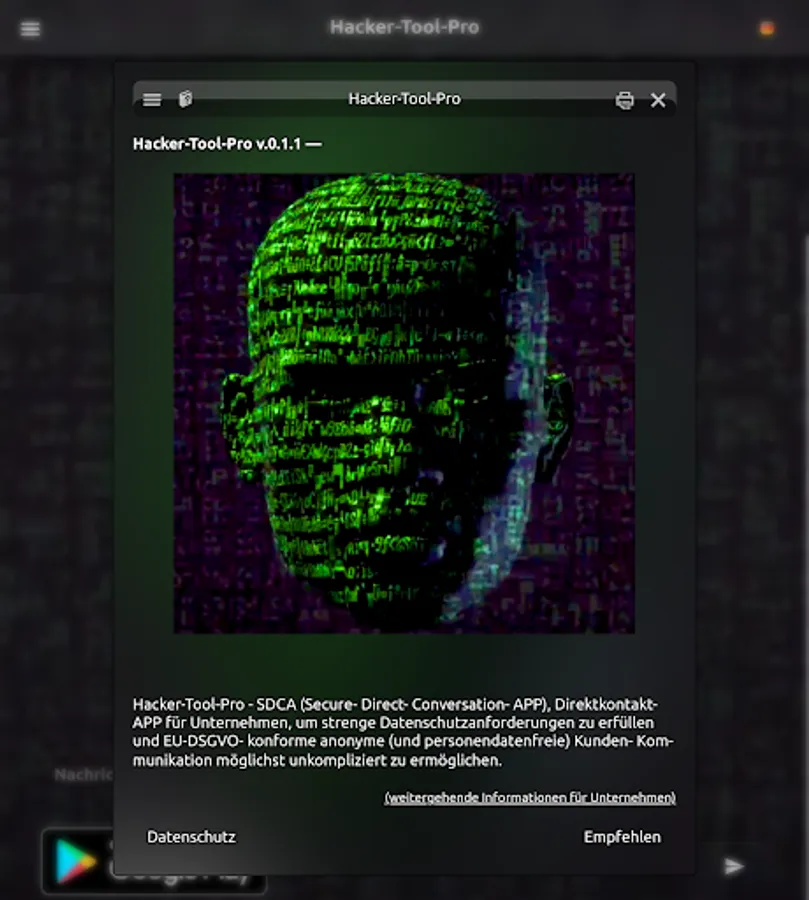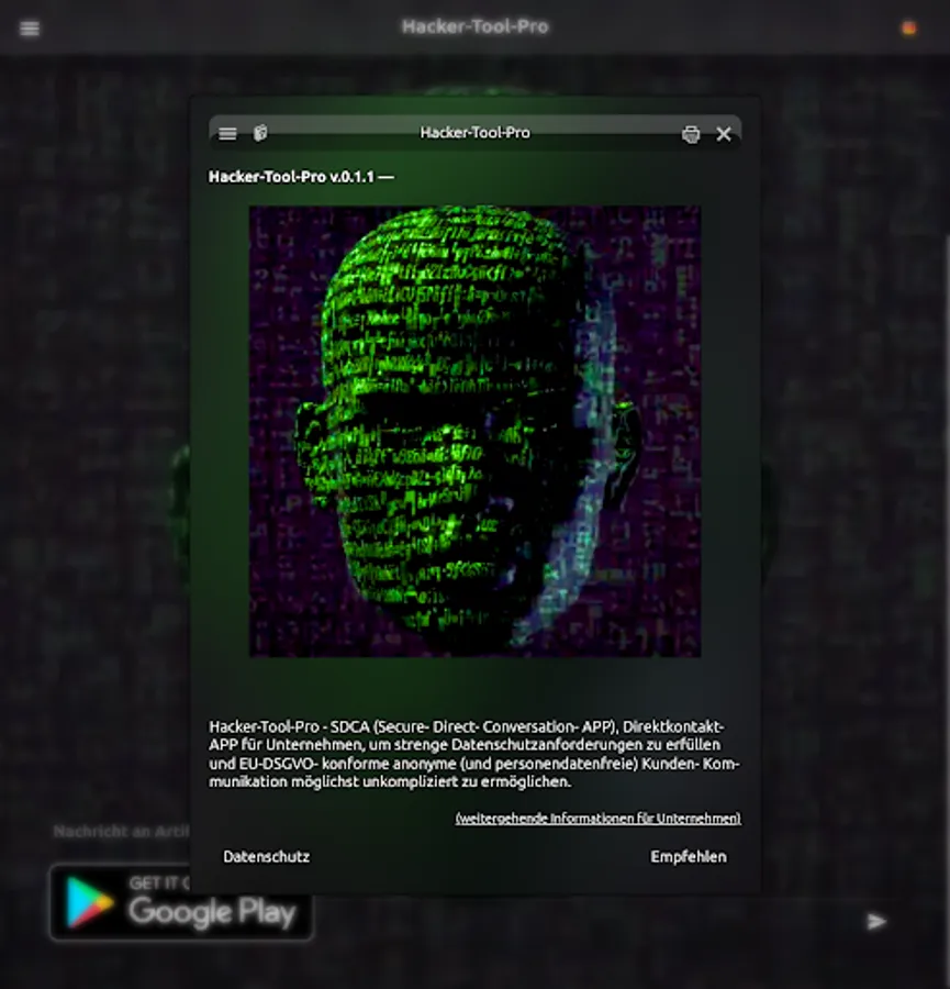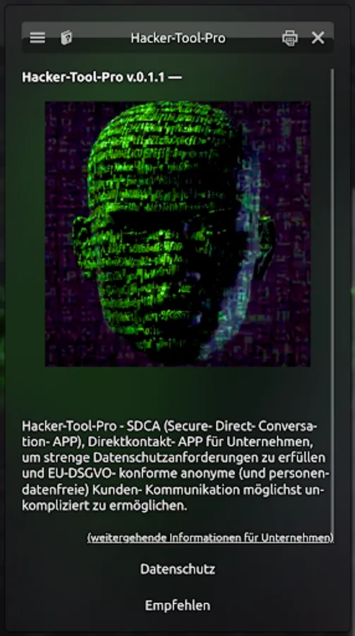 Hacker tool.. by Artificially Intelligence.: Personal SDCA (Secure Direct Conversation App) enables you to communicate directly and meets strict data protection requirements as well as EU-GDPR-compliant anonymous (and personal data-free) customer communication.