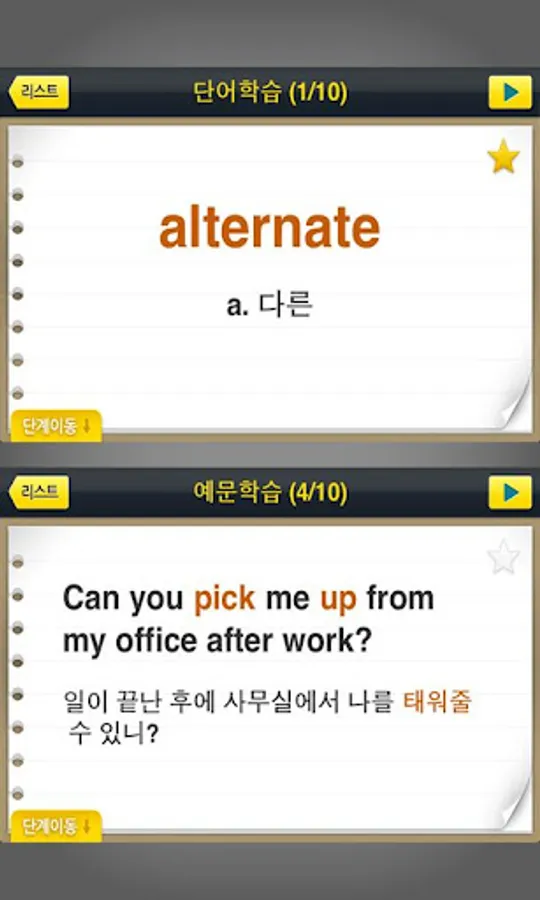 Word example sentence learning (English ▶ Korean), word example sentence learning (Korean ▶ English),